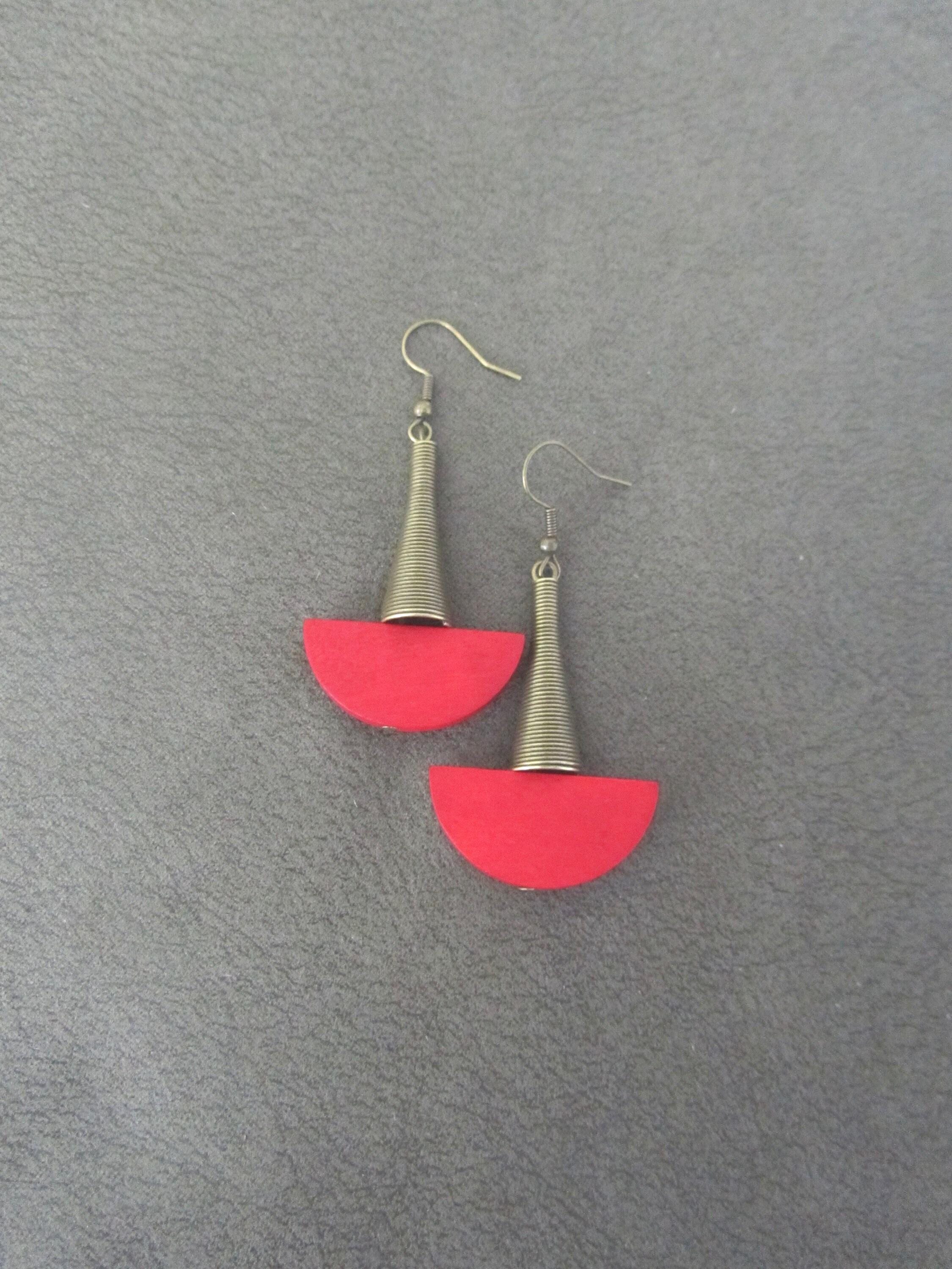 Long brass and red wooden beaded earrings on brass french hooks