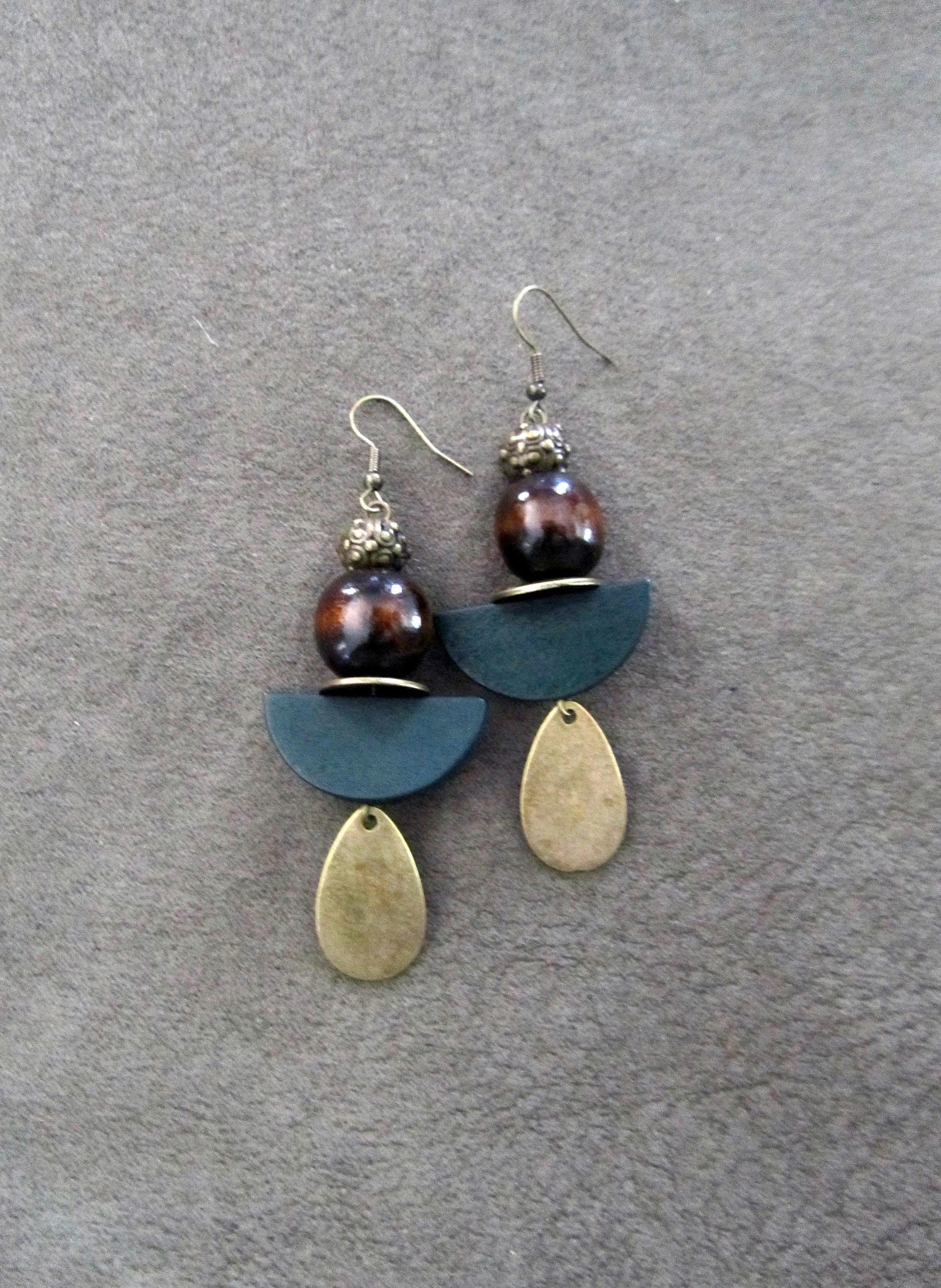 Geometric earrings with brown and green wood and bronze beads with French hooks