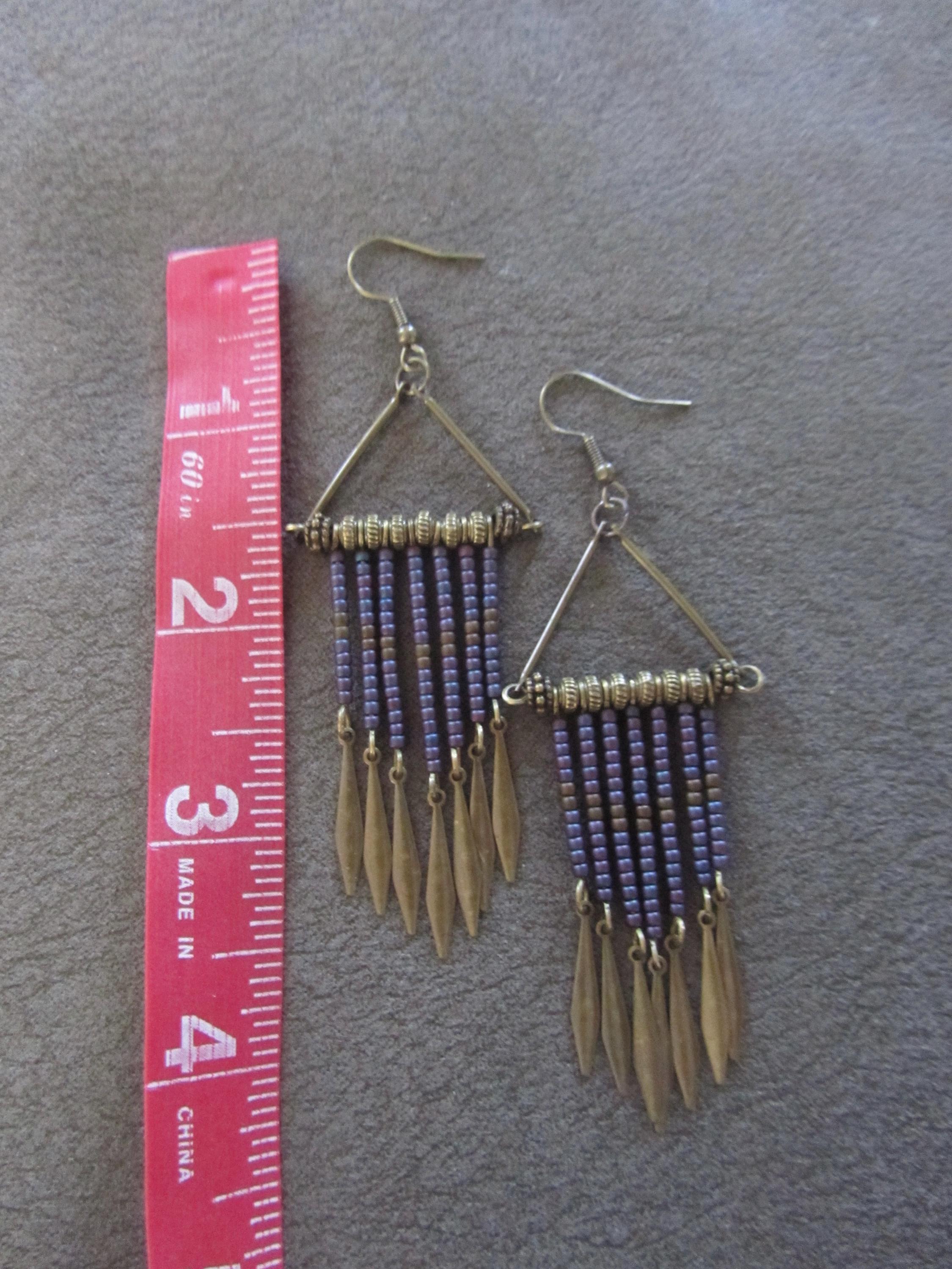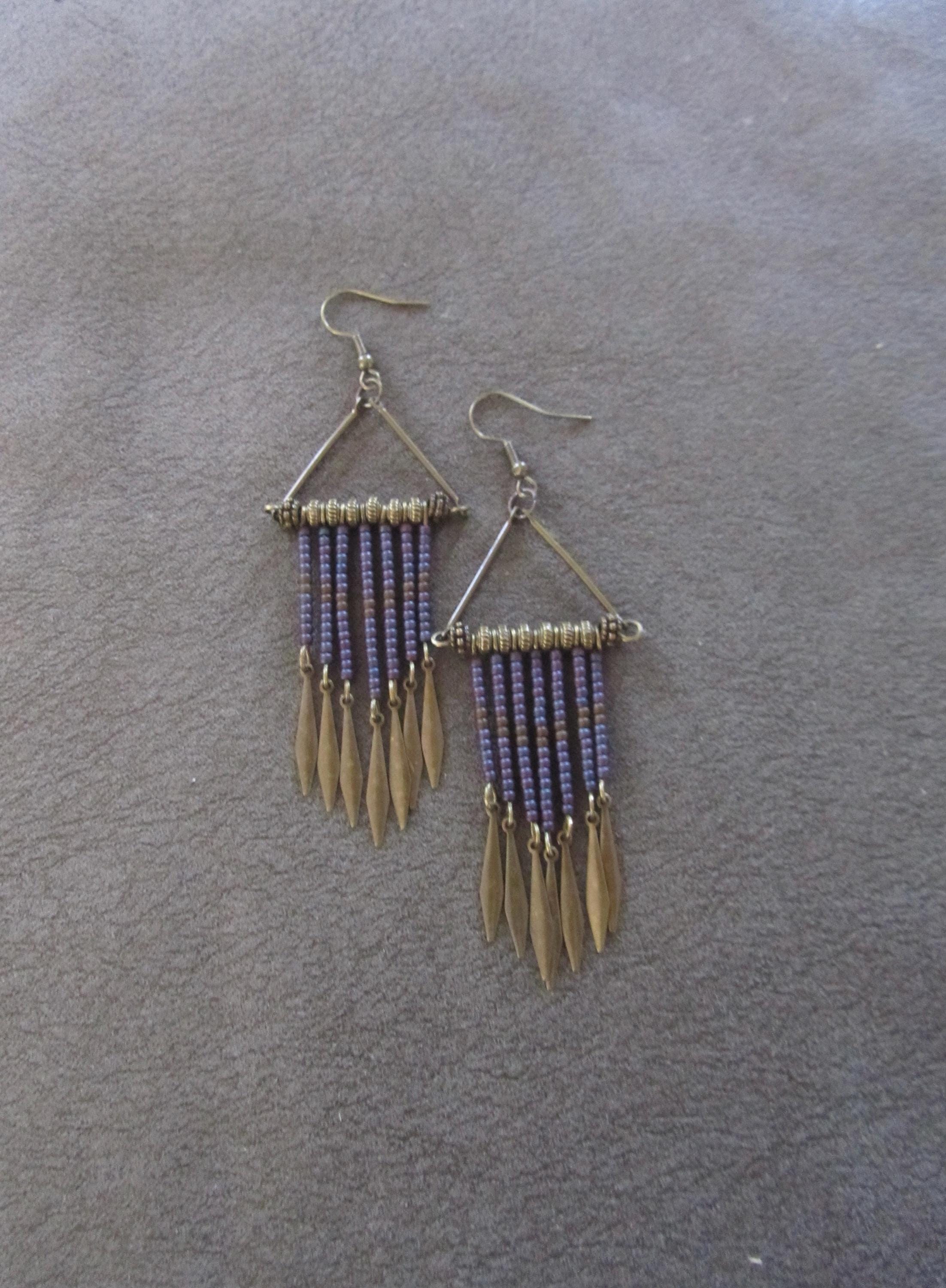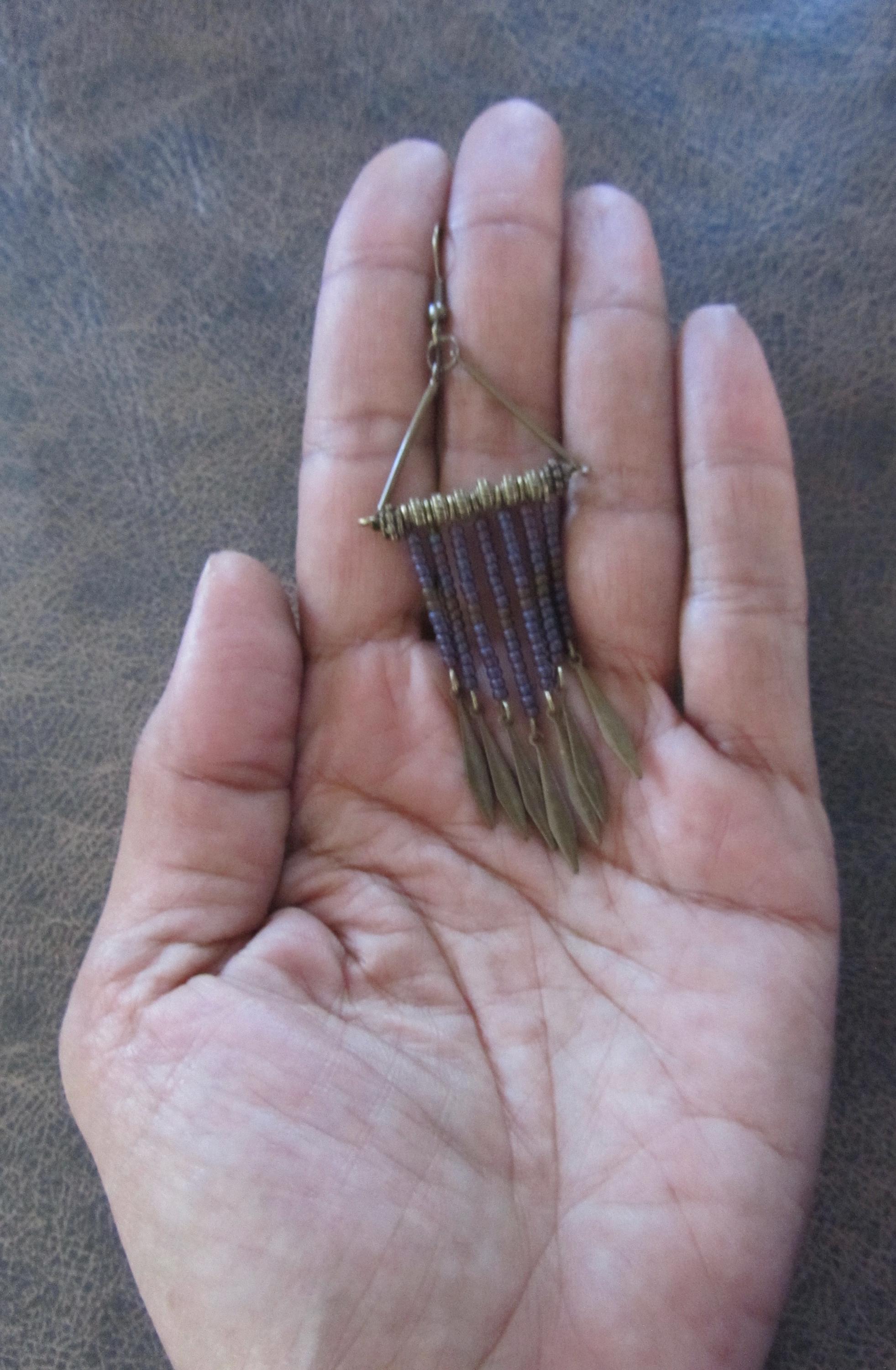 purple and bronze seed bead earrings on French hooks