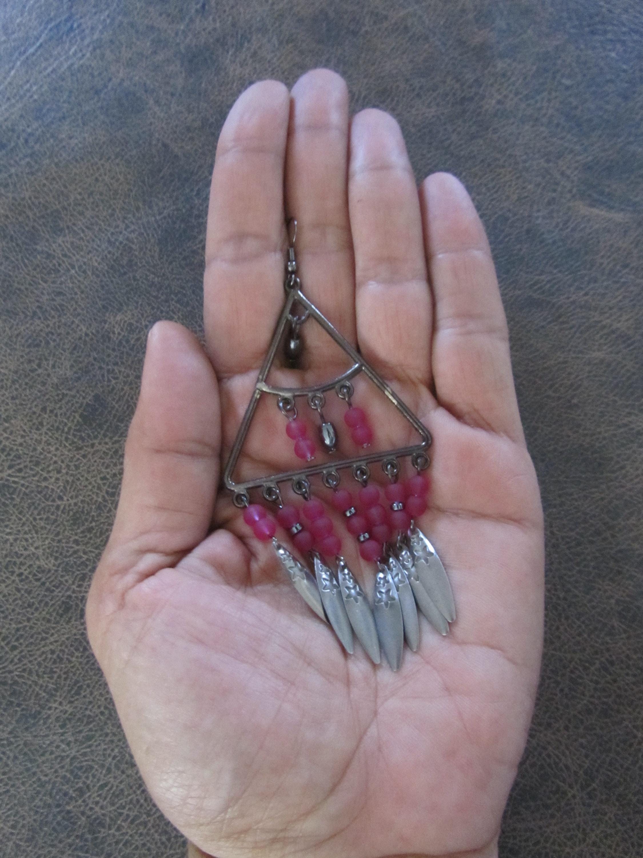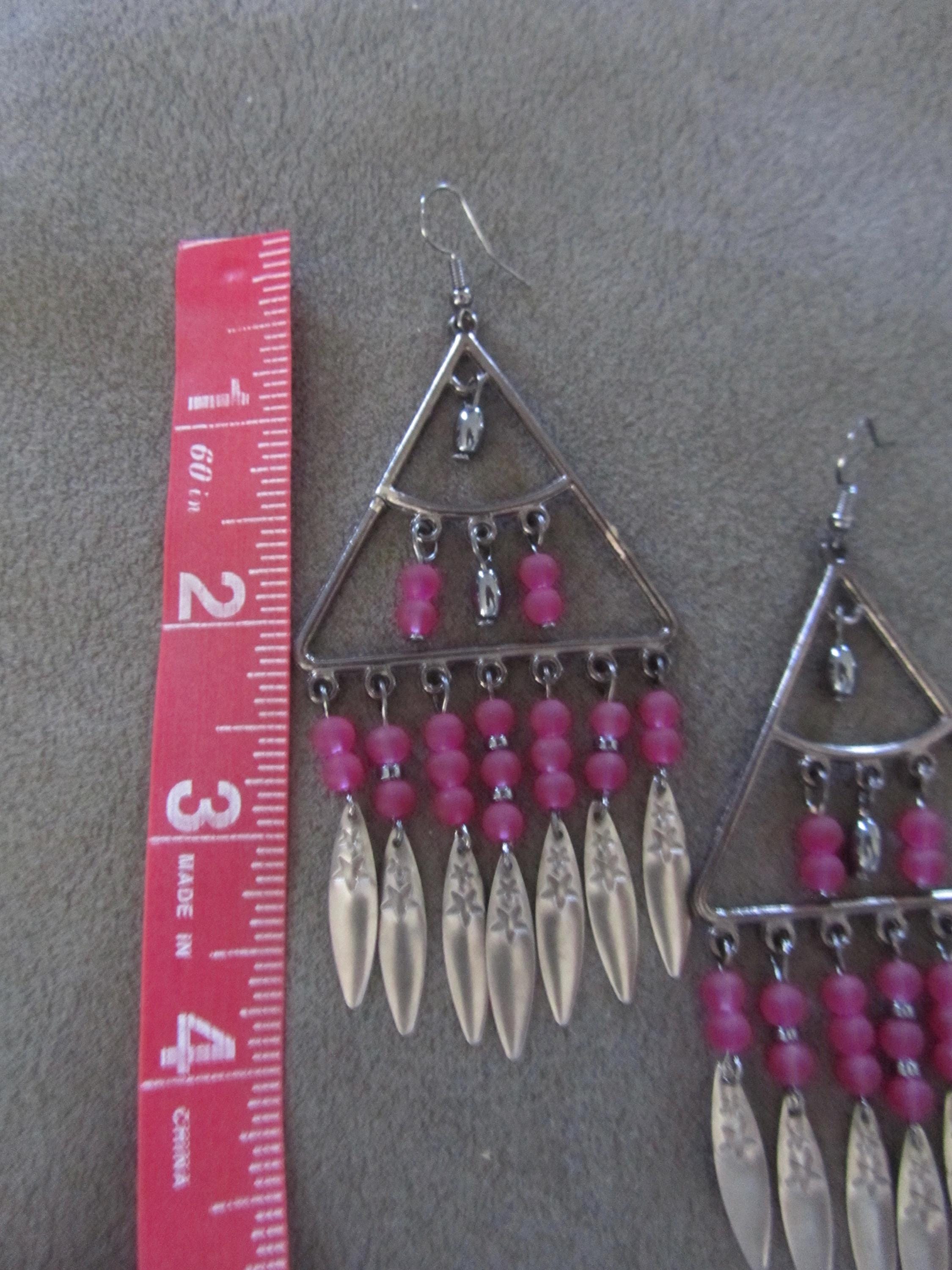 Gunmetal gray chandelier earrings with pink glass beads on French hooks