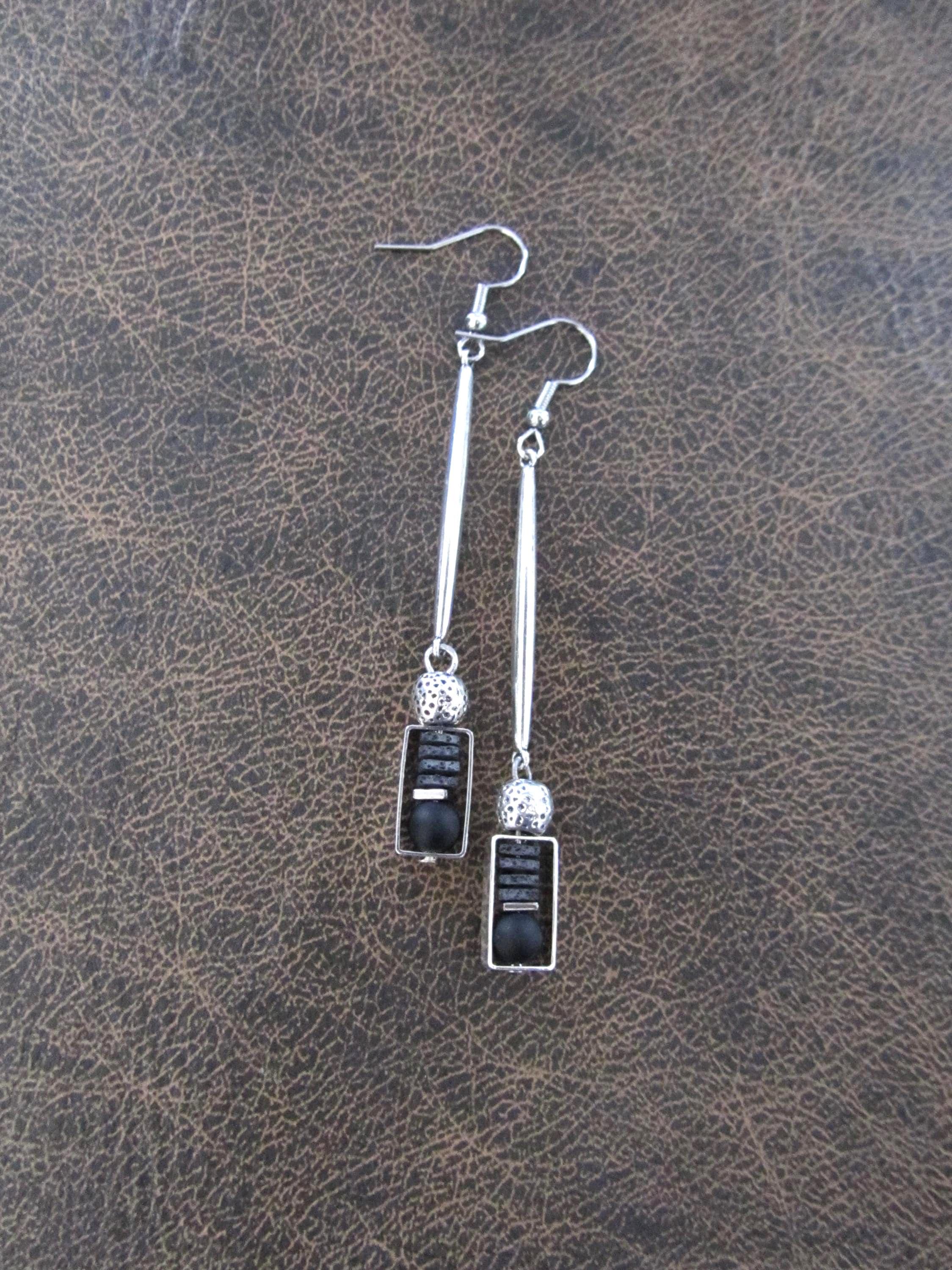Minimalist black frosted glass and lava rock earrings with French hooks