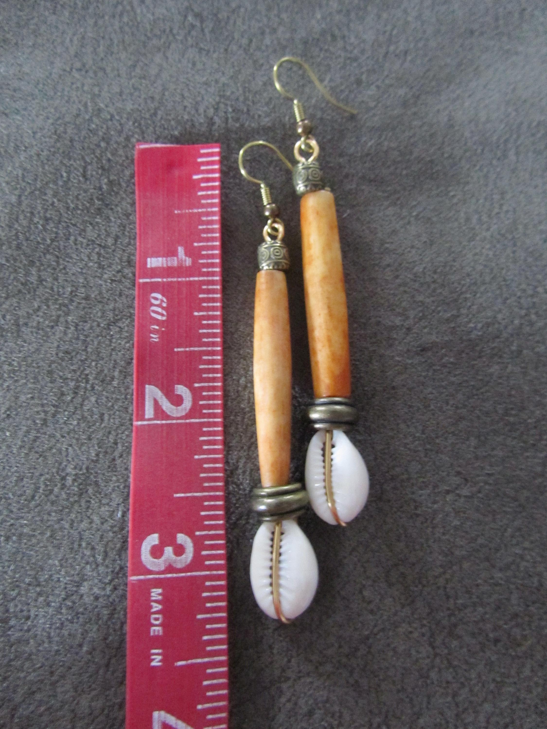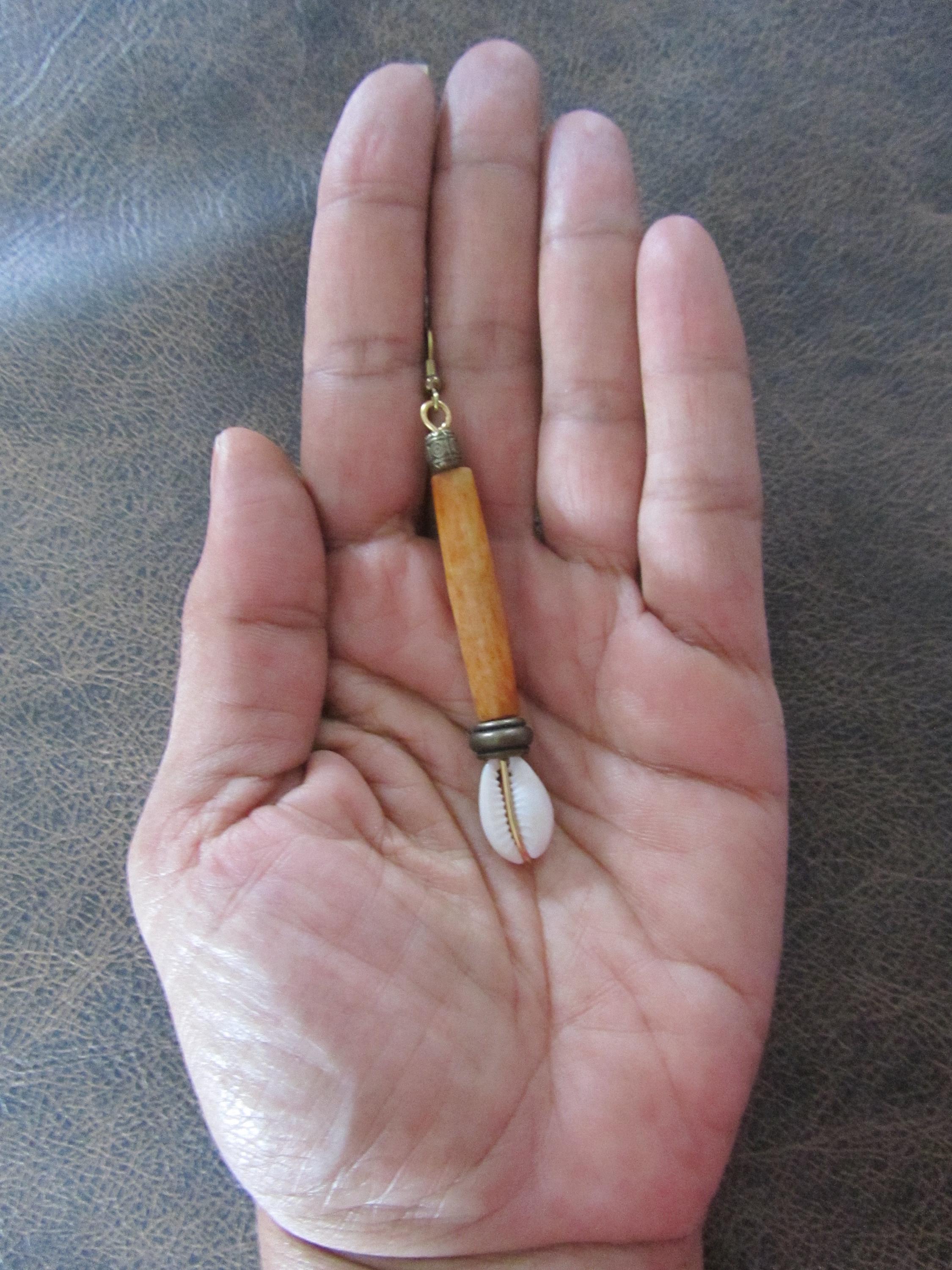 Extra long orangish brown carved horn and cowrie shell dangle earrings with French hooks