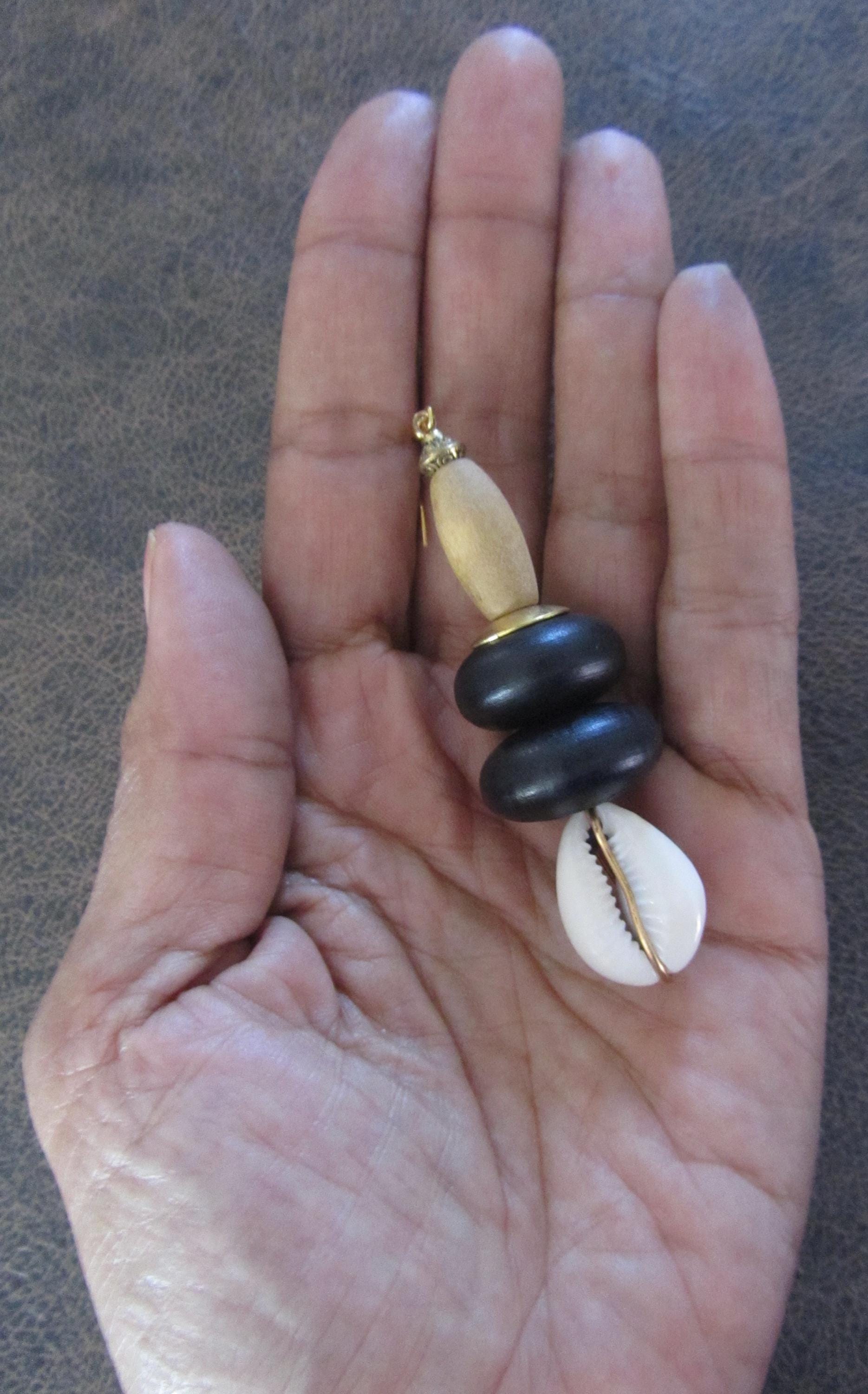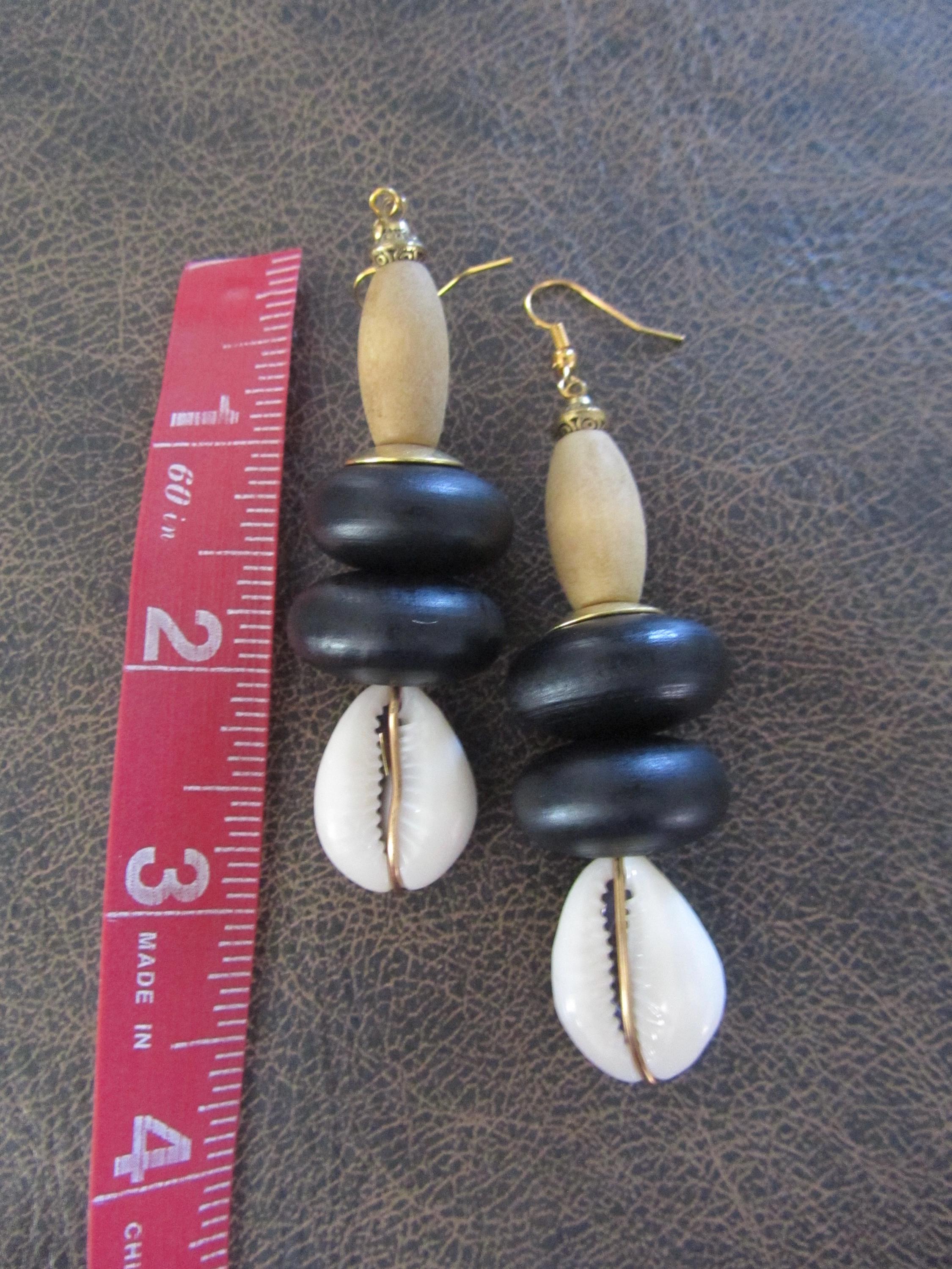 Wooden and cowrie shell earrings. French hooks