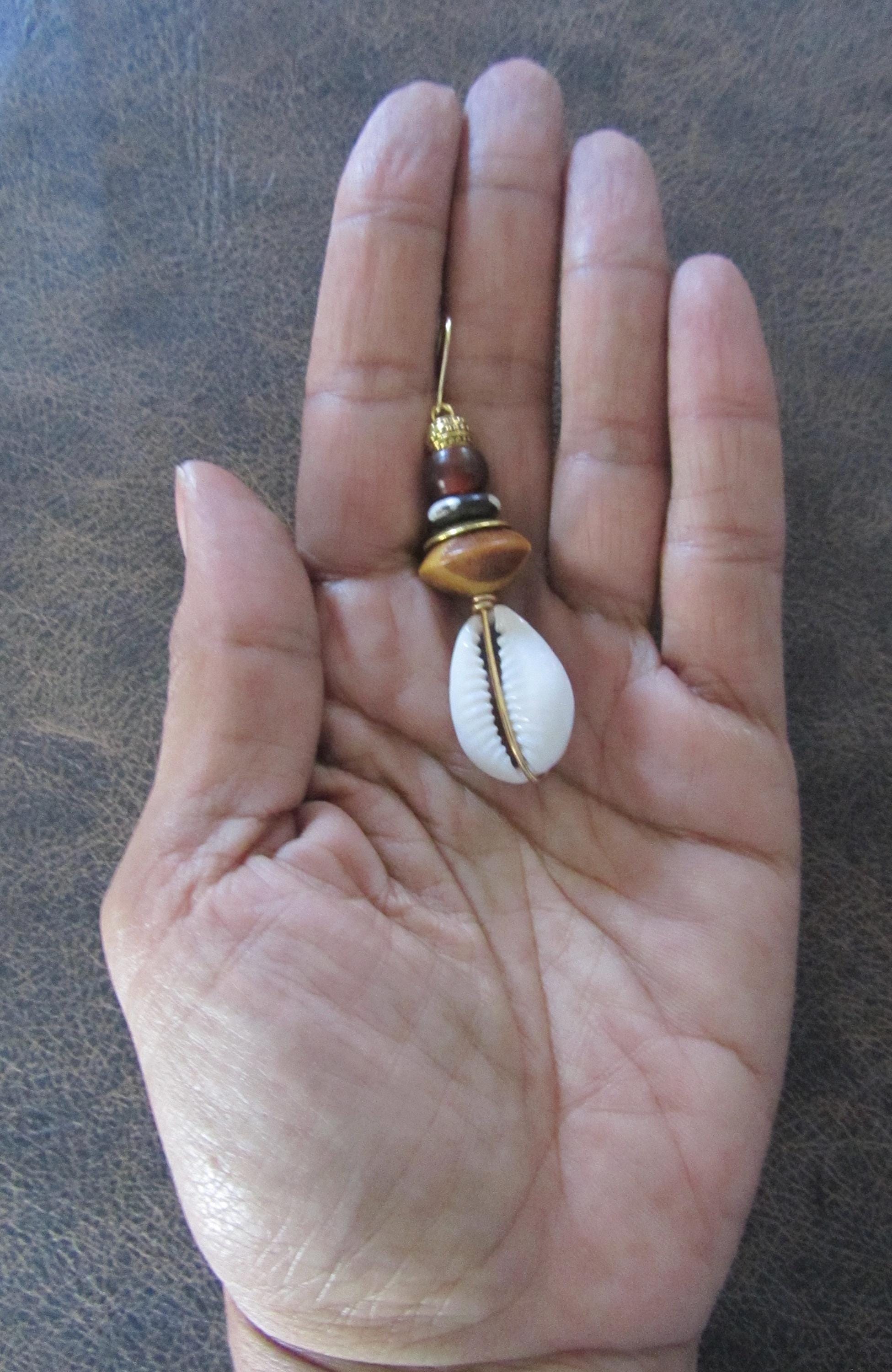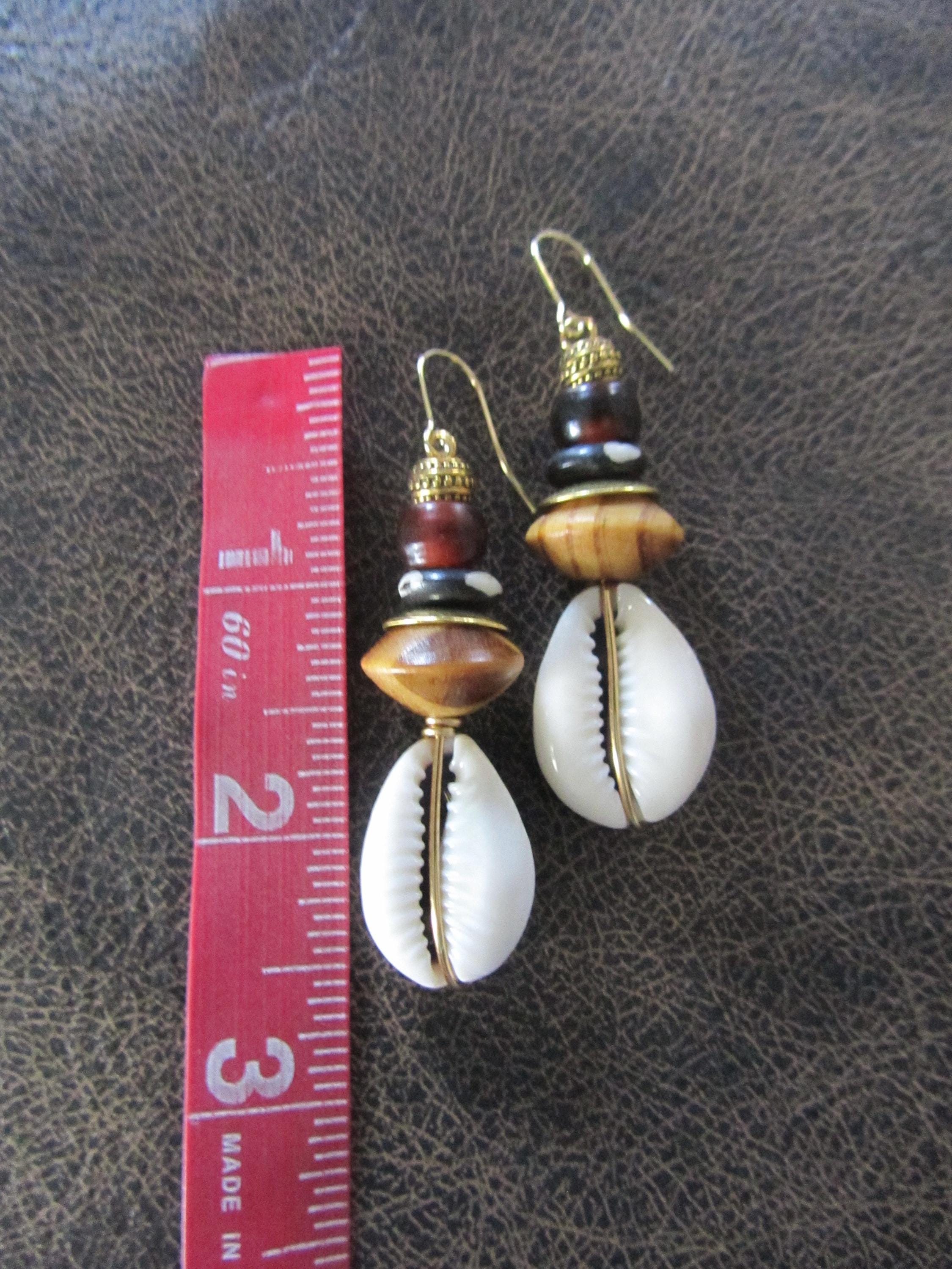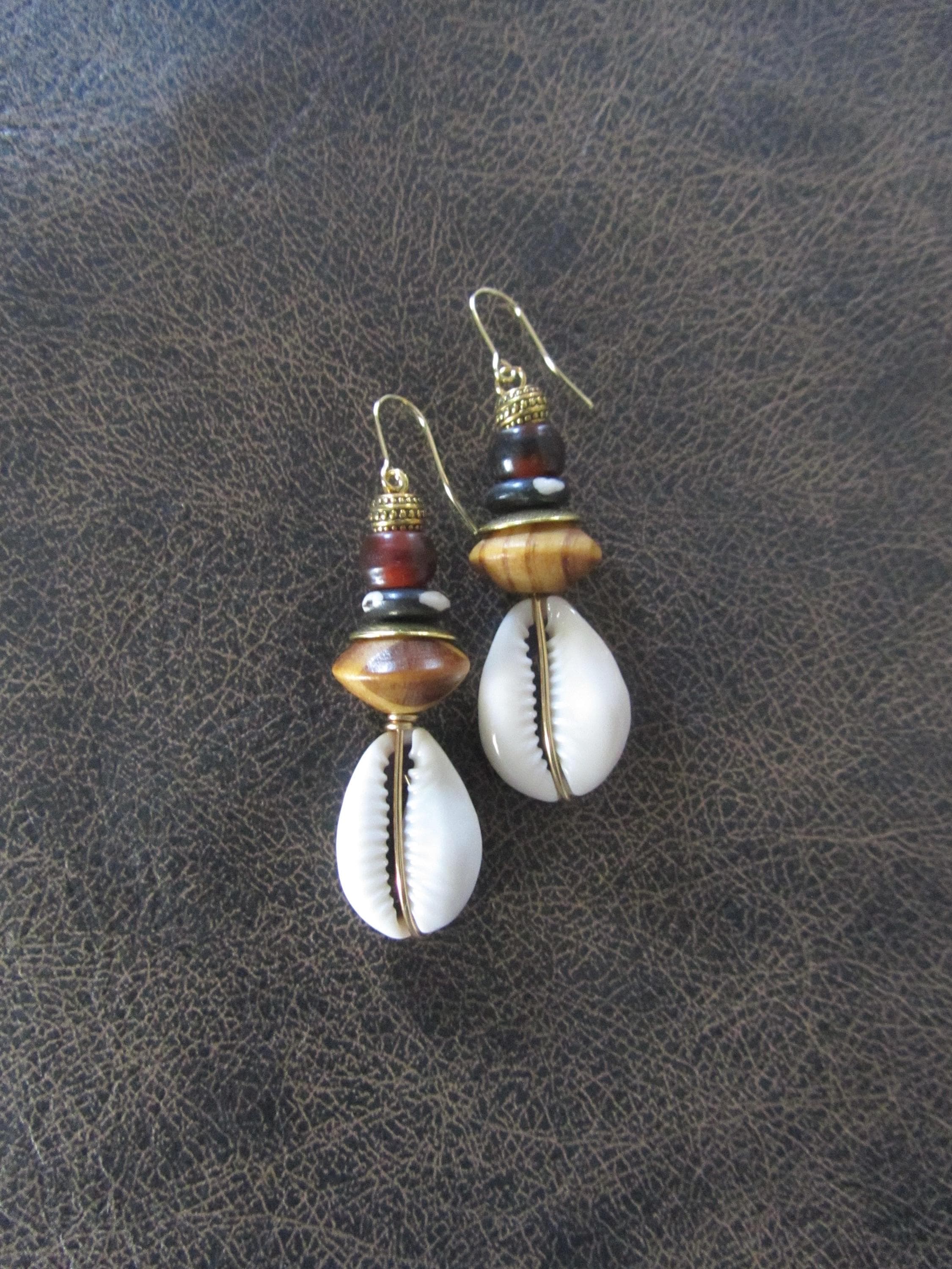 Cowrie shell, bone, ceramic and wooden dangle earrings. French hooks