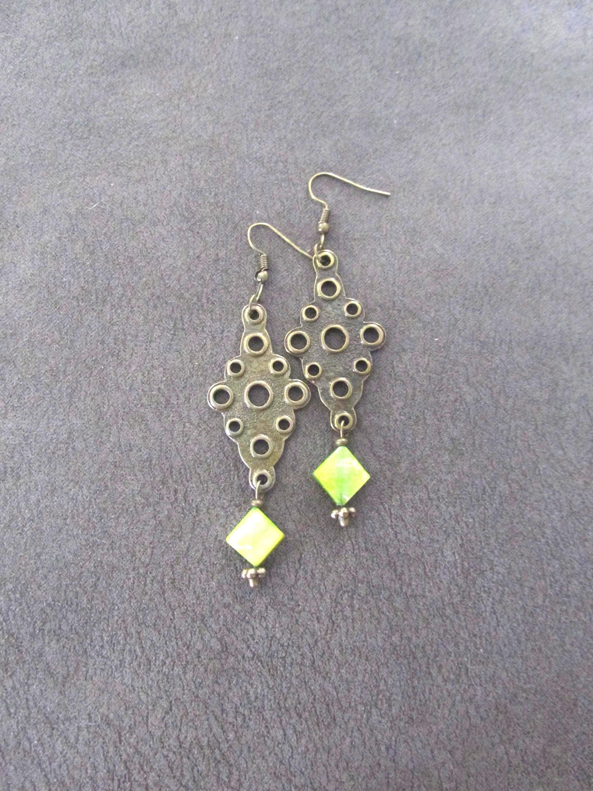 Bronze and green mother of pearl shells with French hooks.