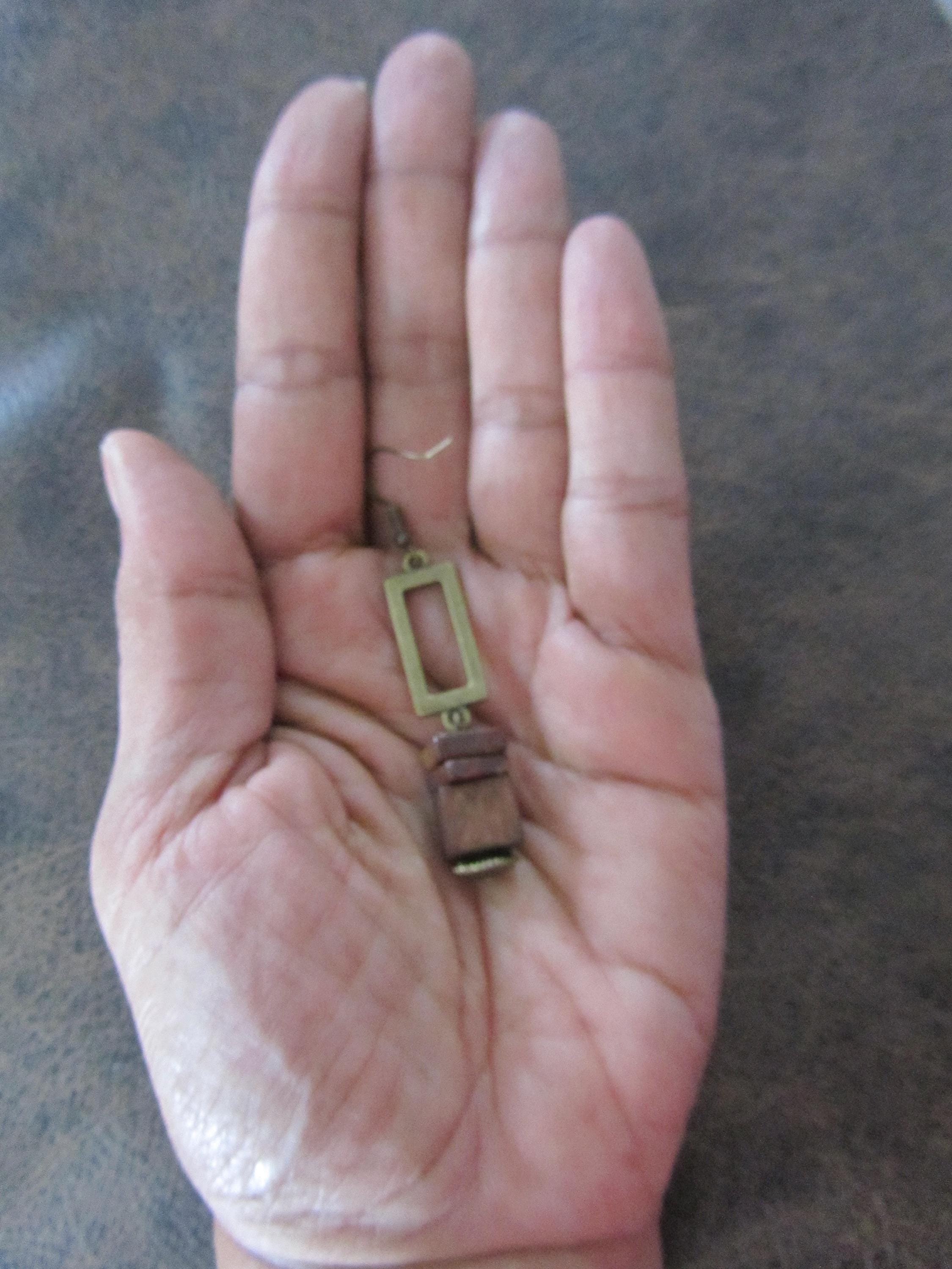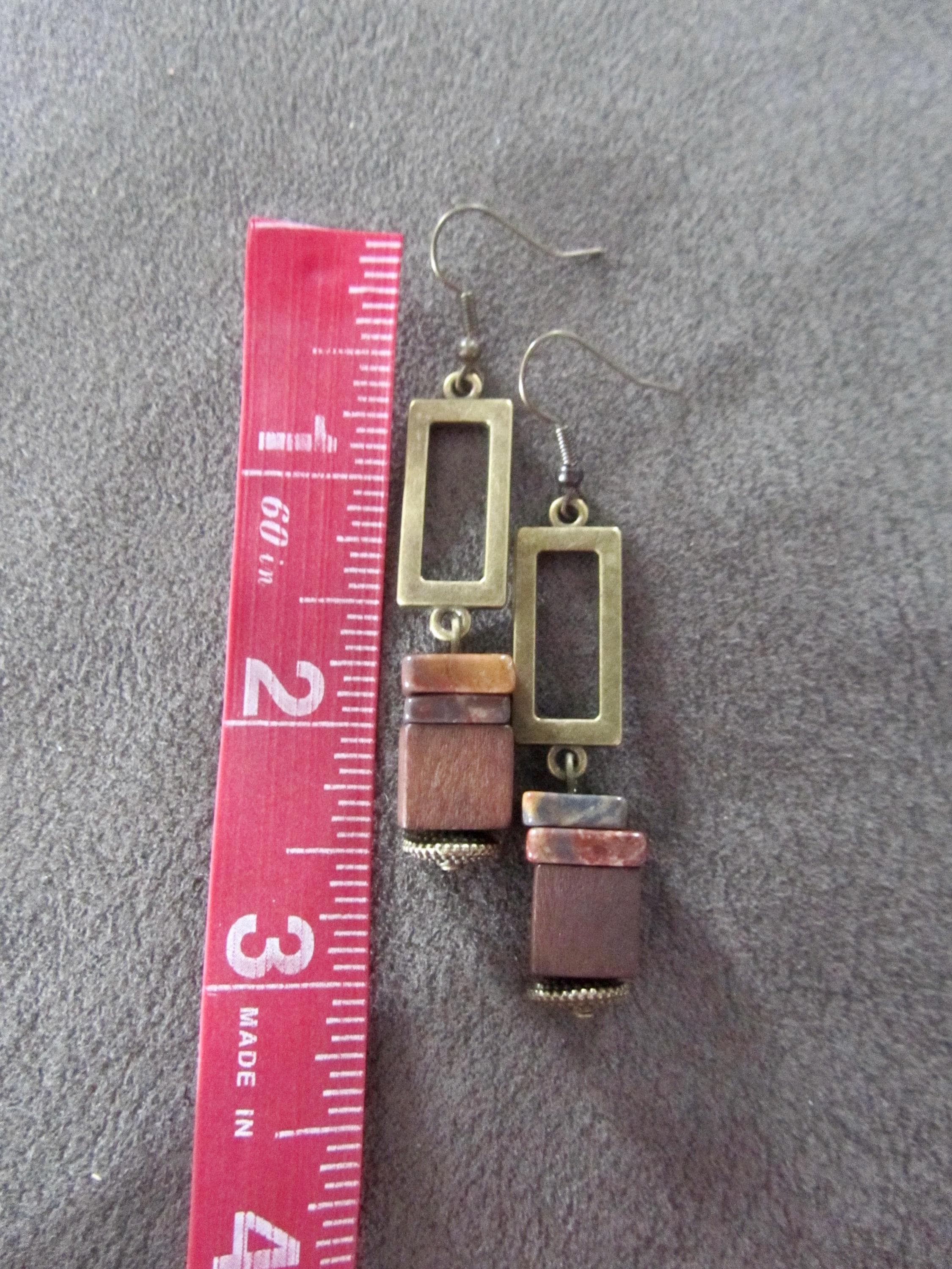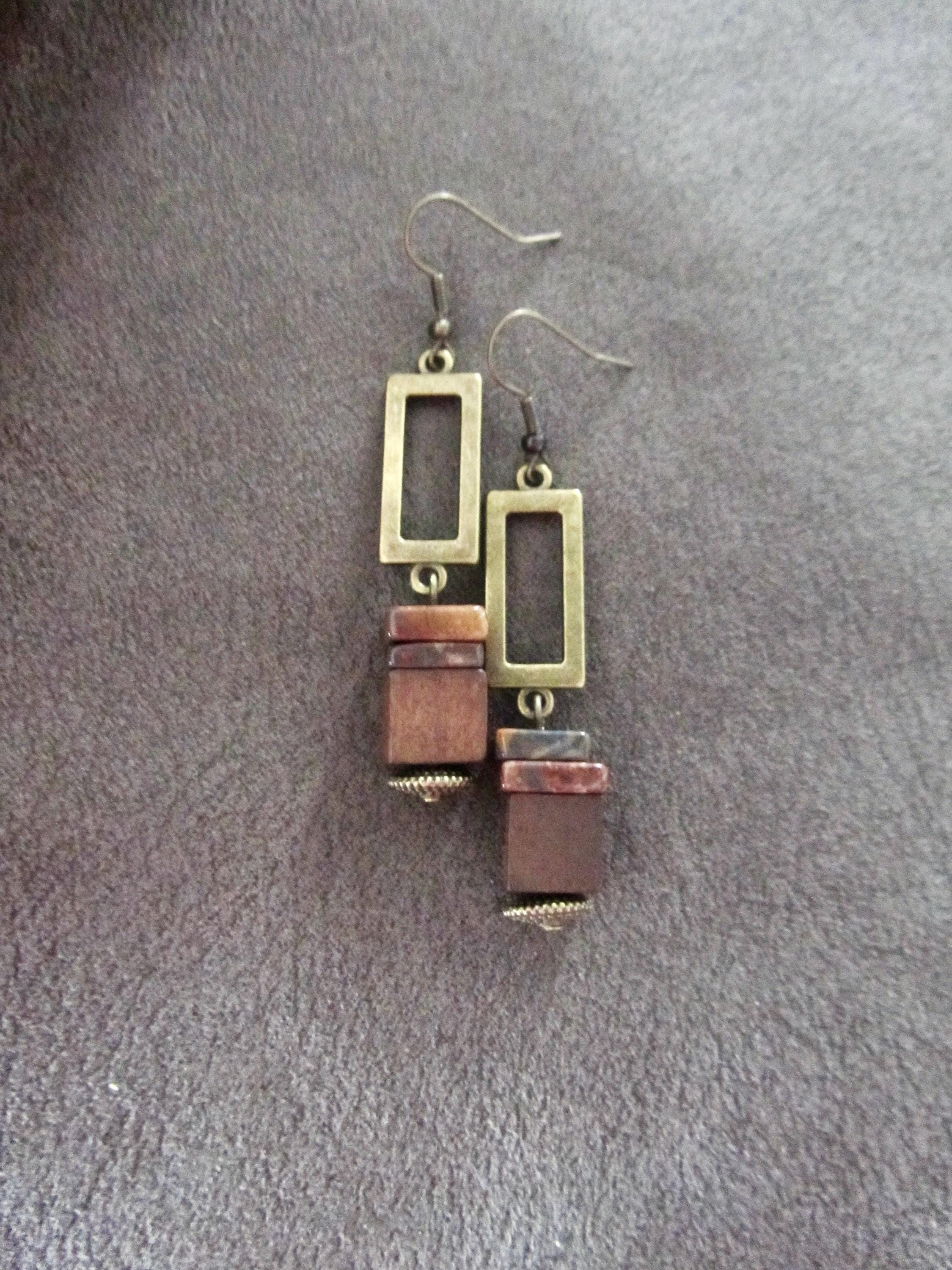 Brown wood and jasper stone and bronze earrings on French hooks
