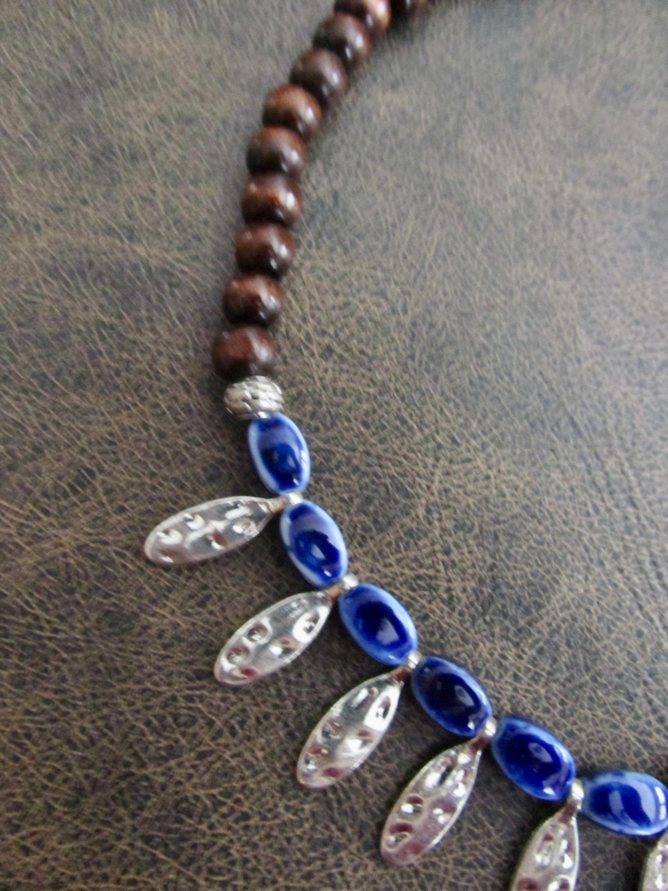 Blue ceramic and brown wooden beaded necklace with toggle clasp.