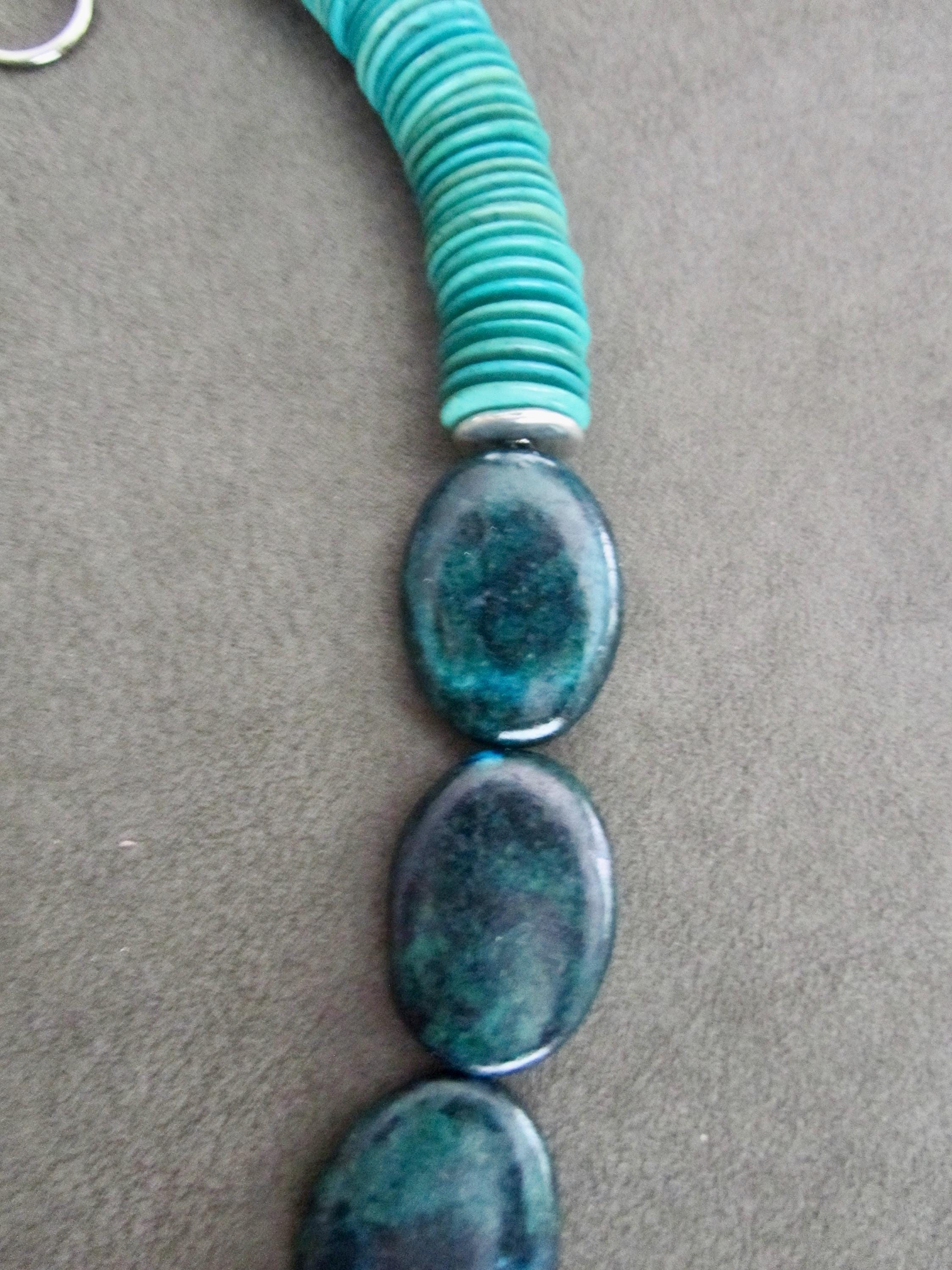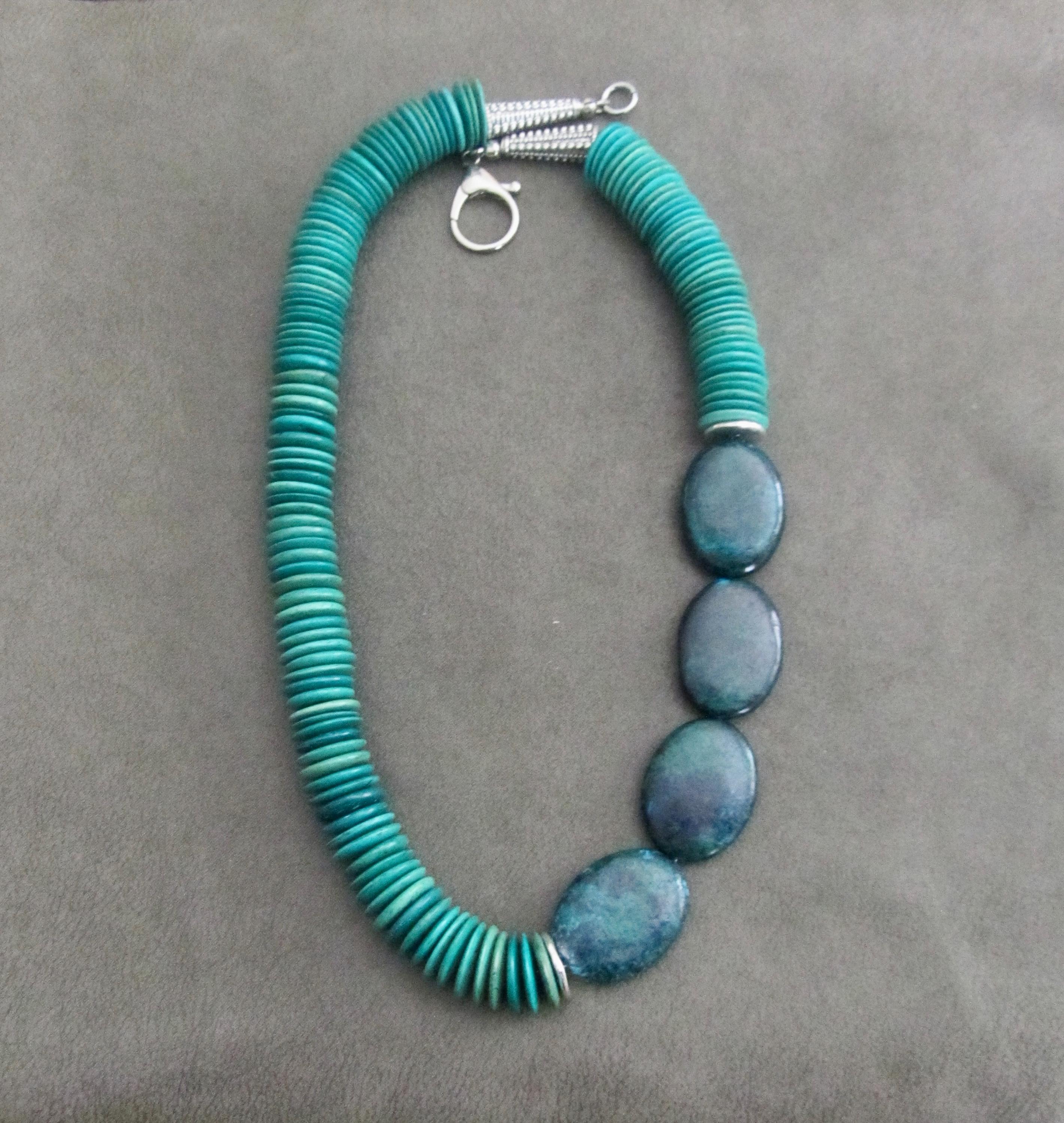 Turquoise and wooden beaded chunky necklace. Claw clasp