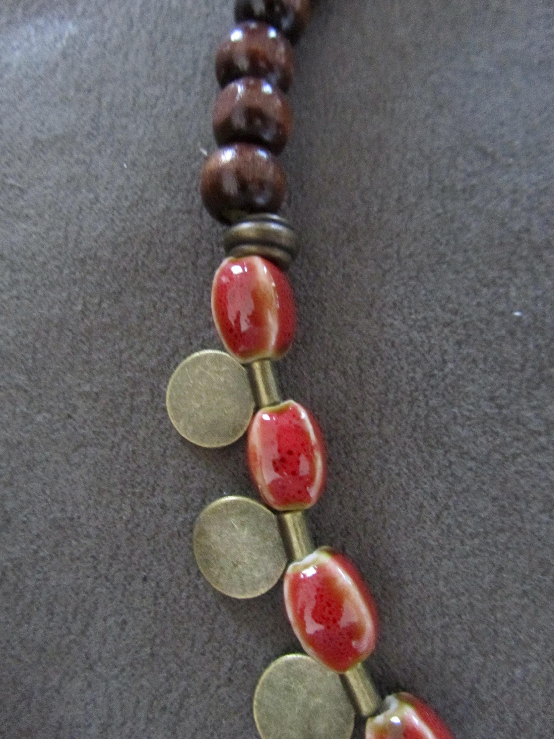 Blue ceramic and brown wooden beaded necklace with toggle clasp.