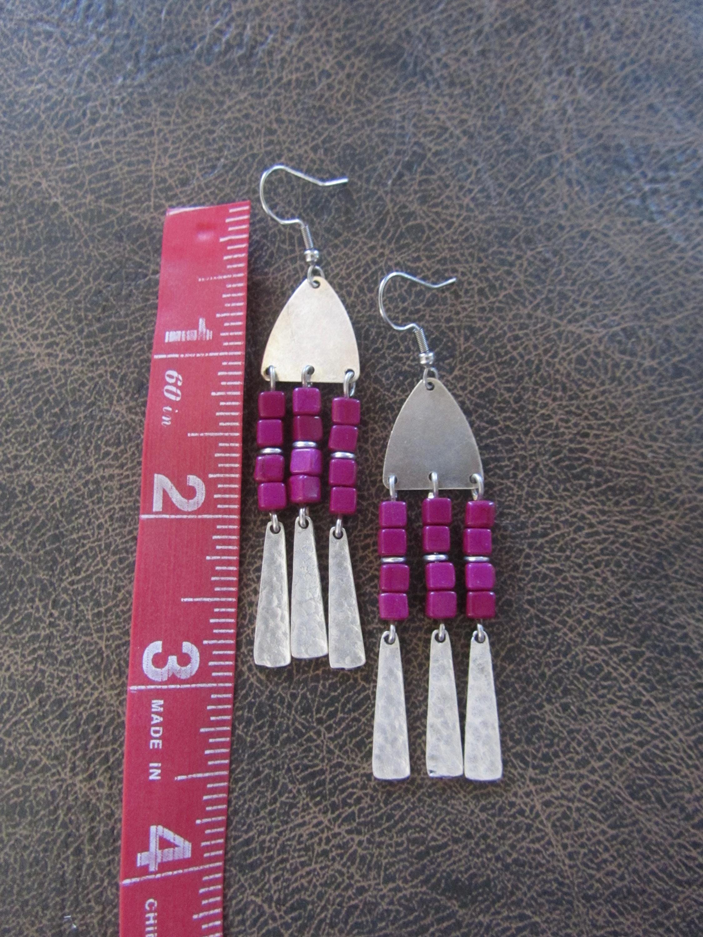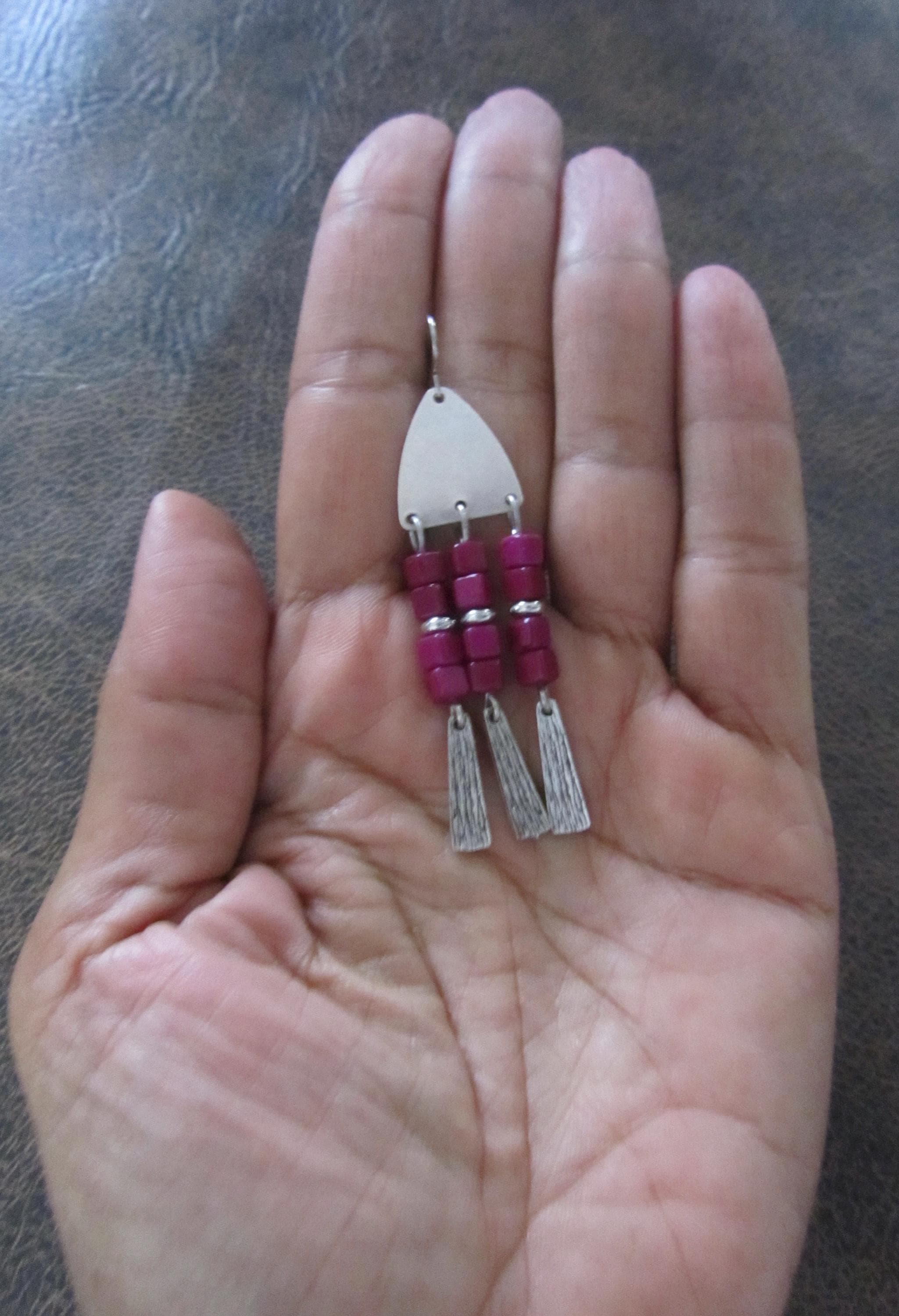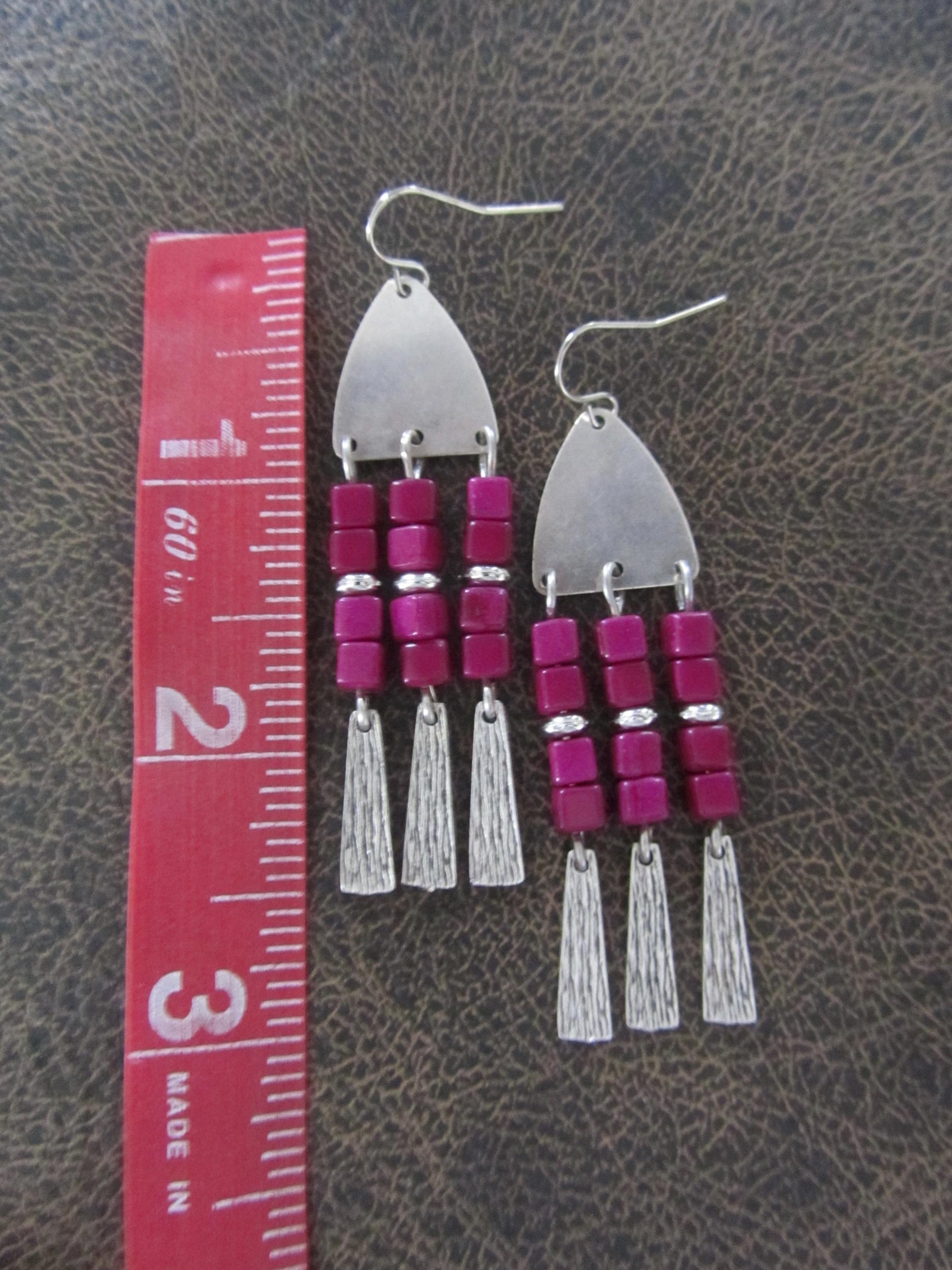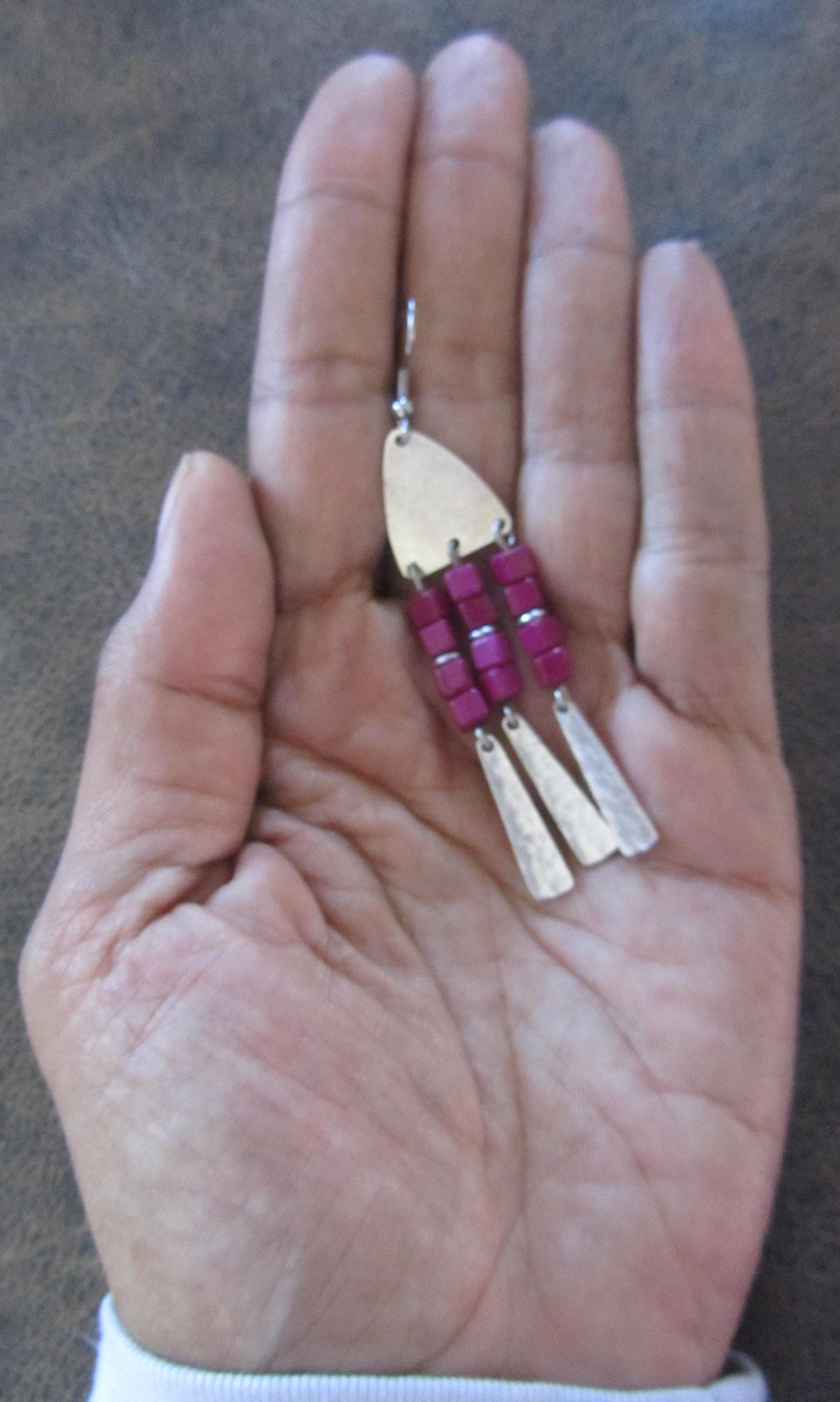 Purplish pink seed bead and silver dangle earrings on French hooks