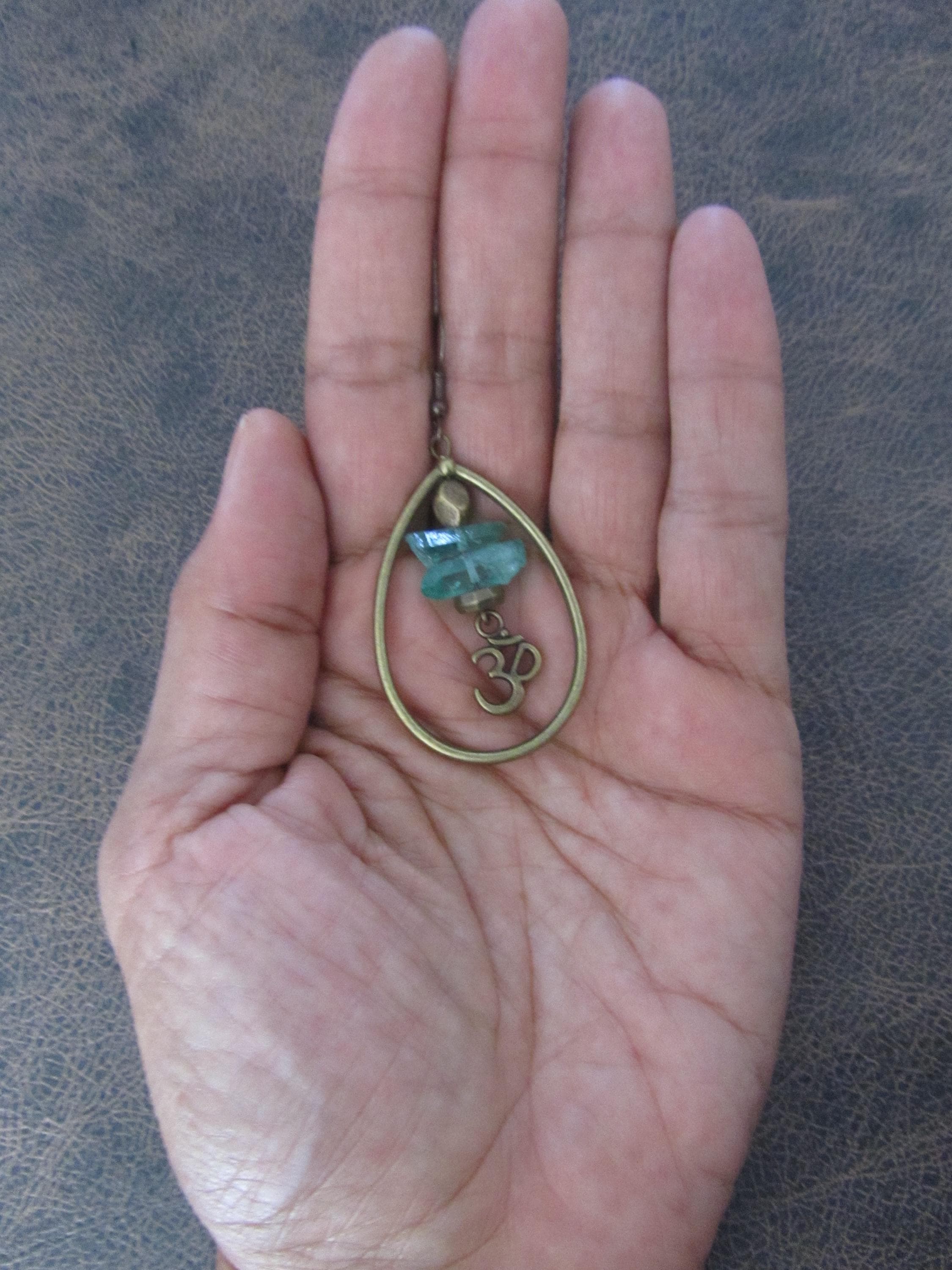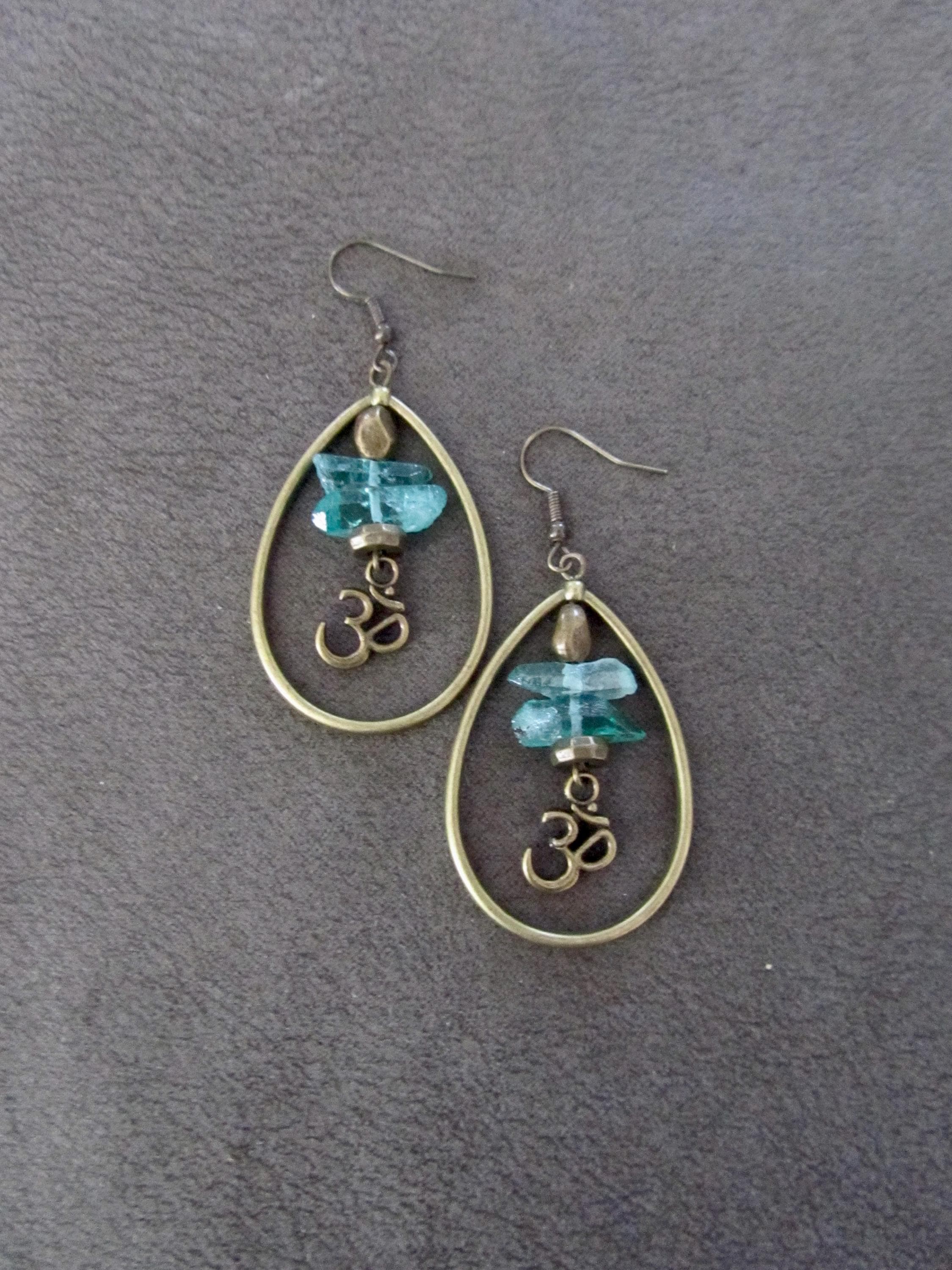Green crystal and bronze om dangle teardrop hoop earrings on French hooks