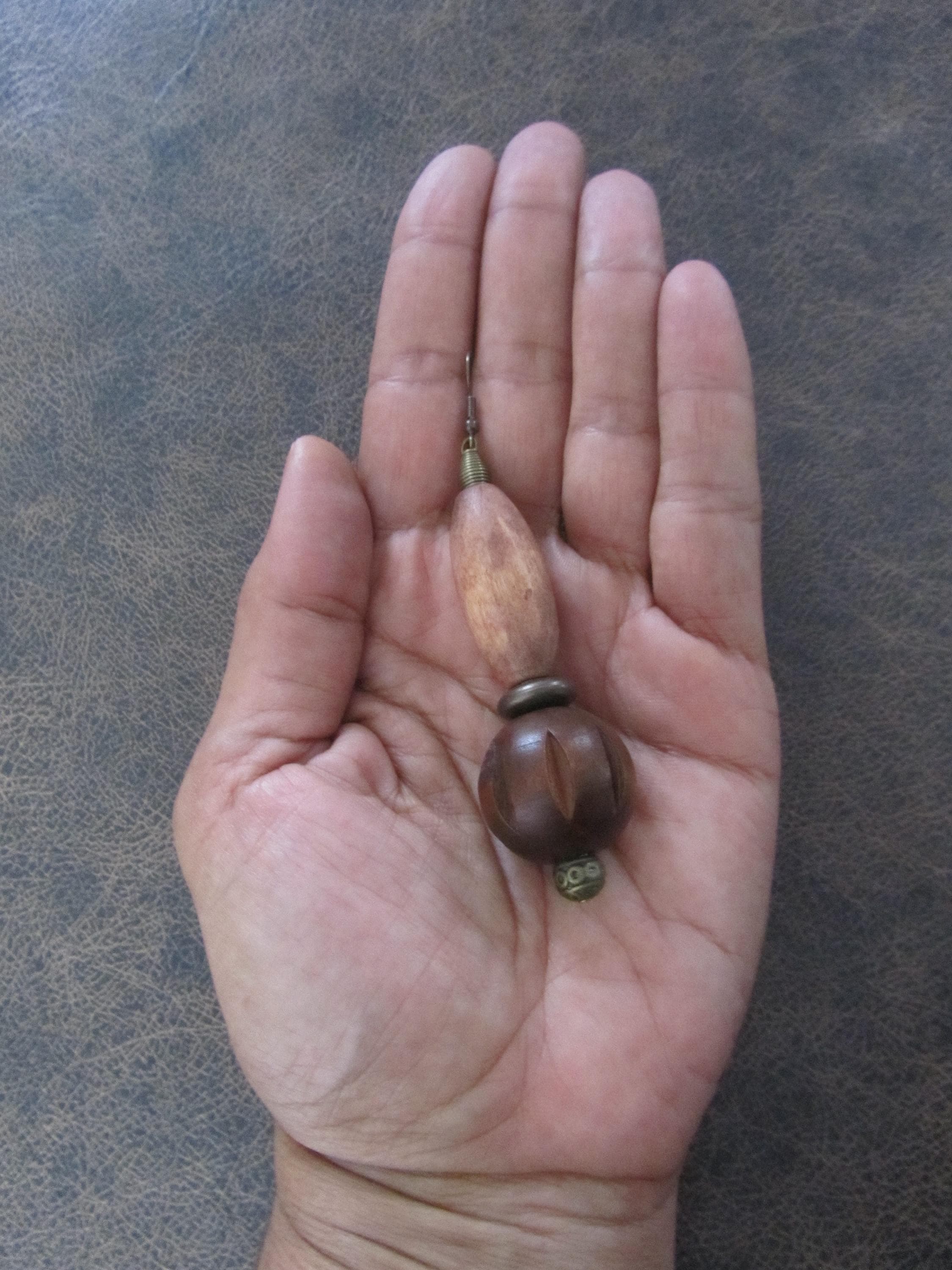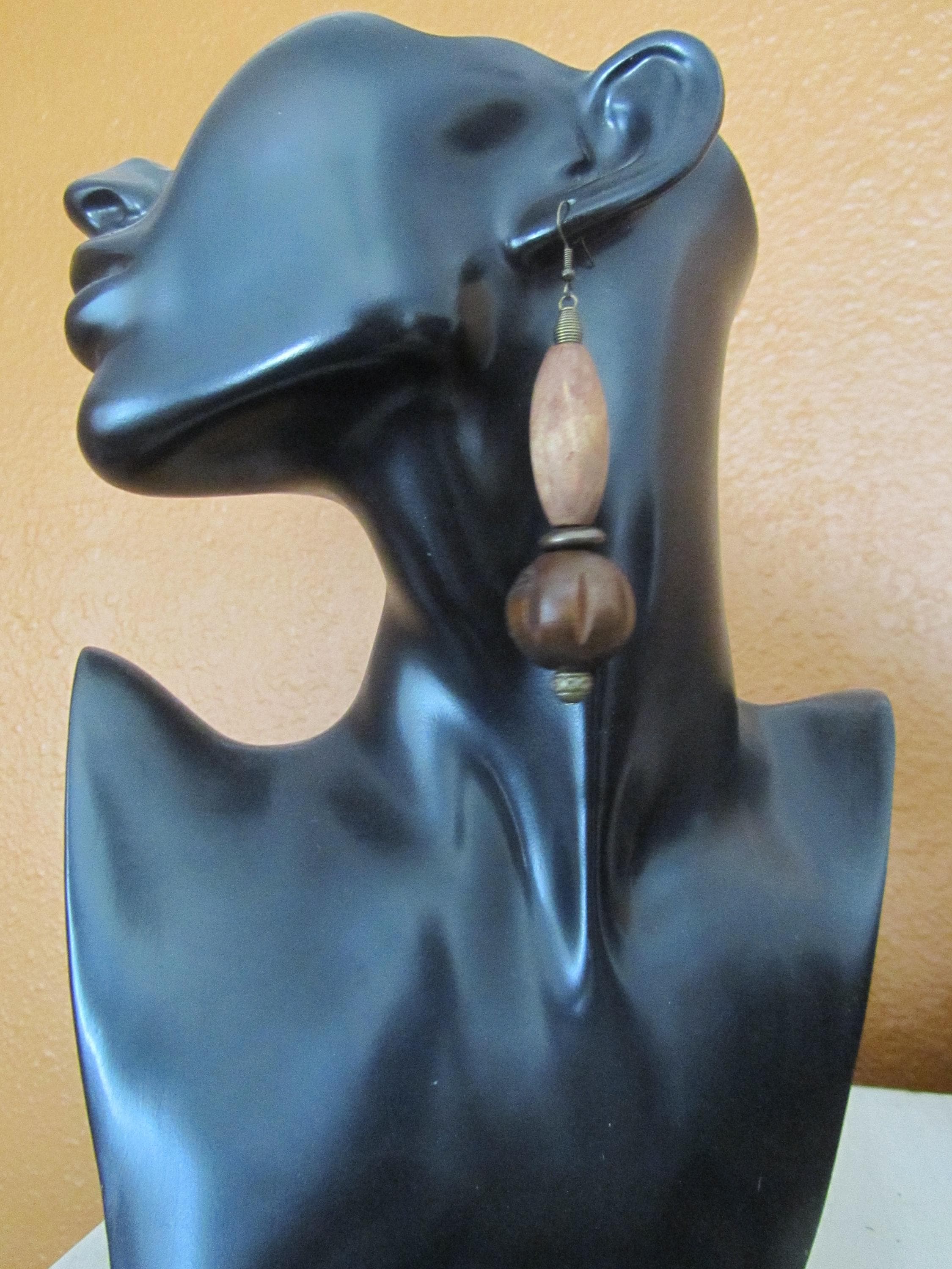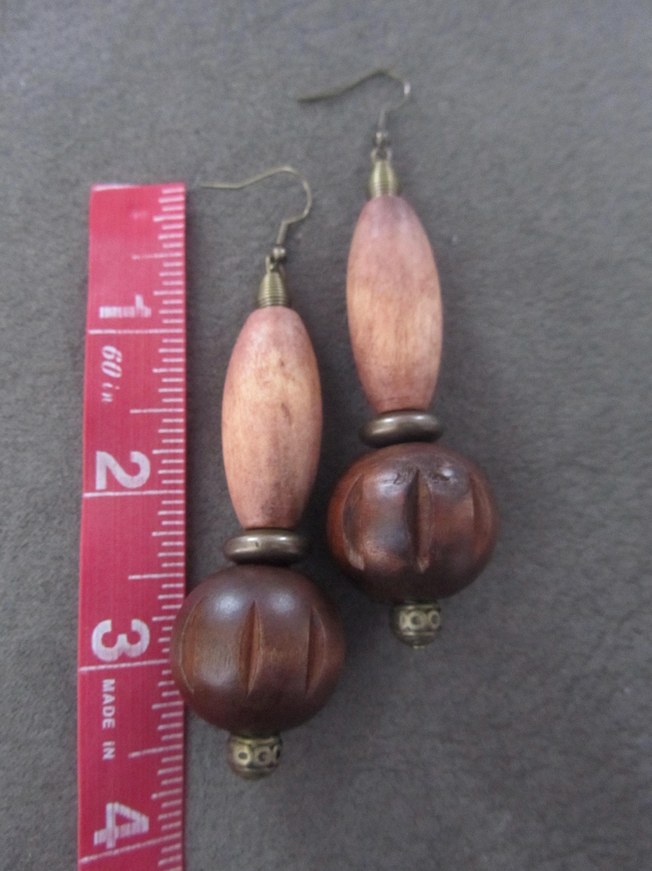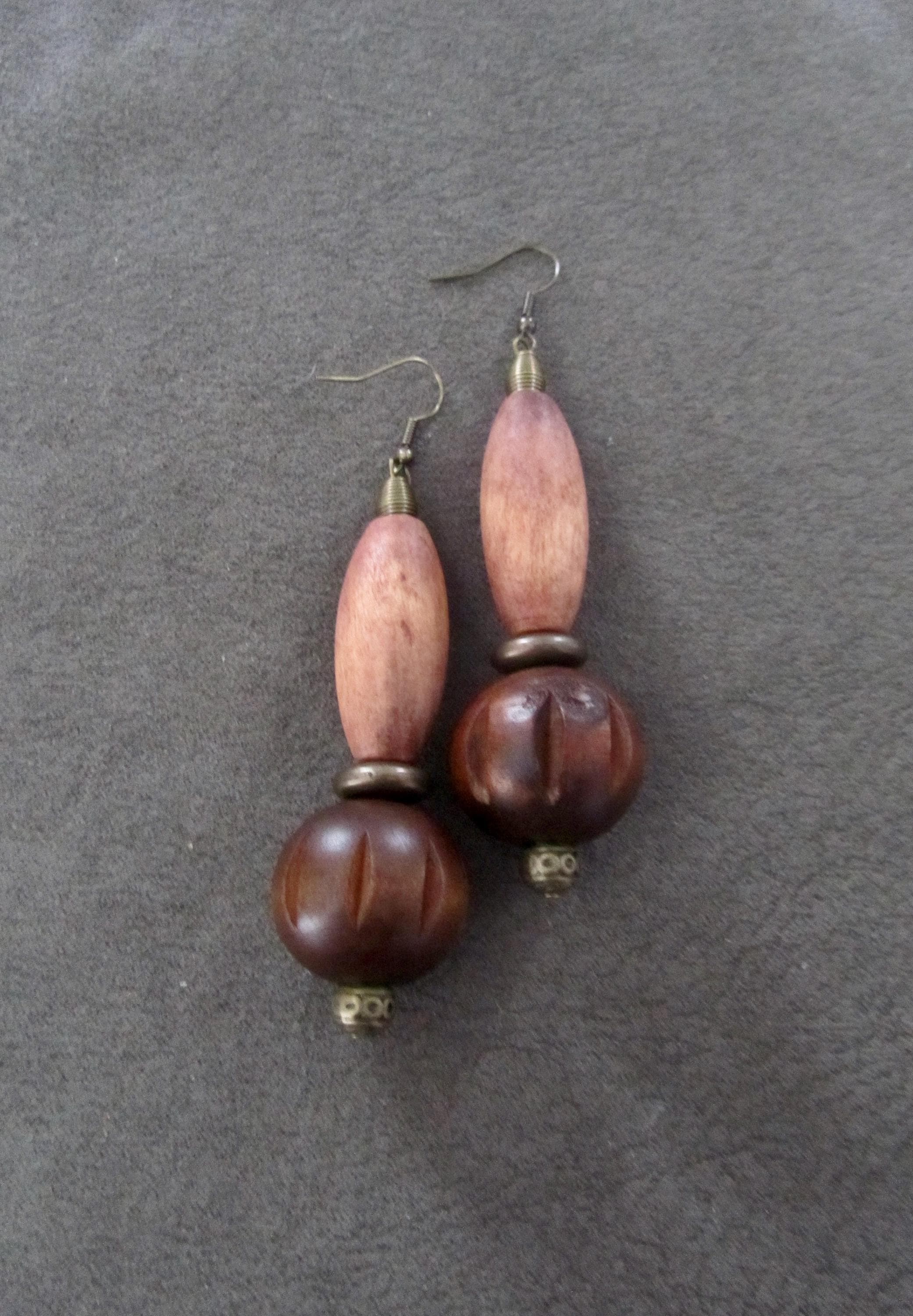 Geometric earrings with wood and bronze beads with French hooks