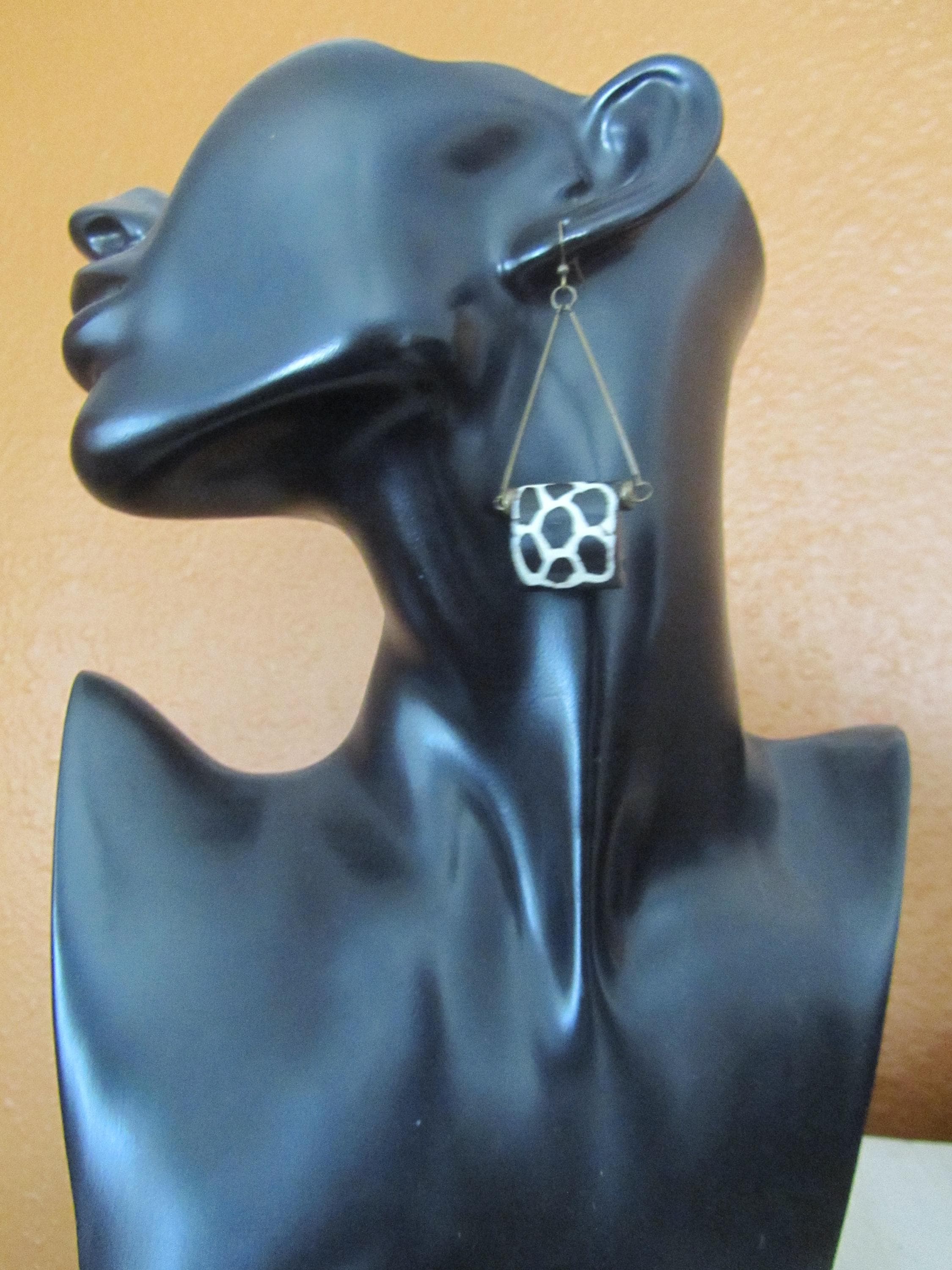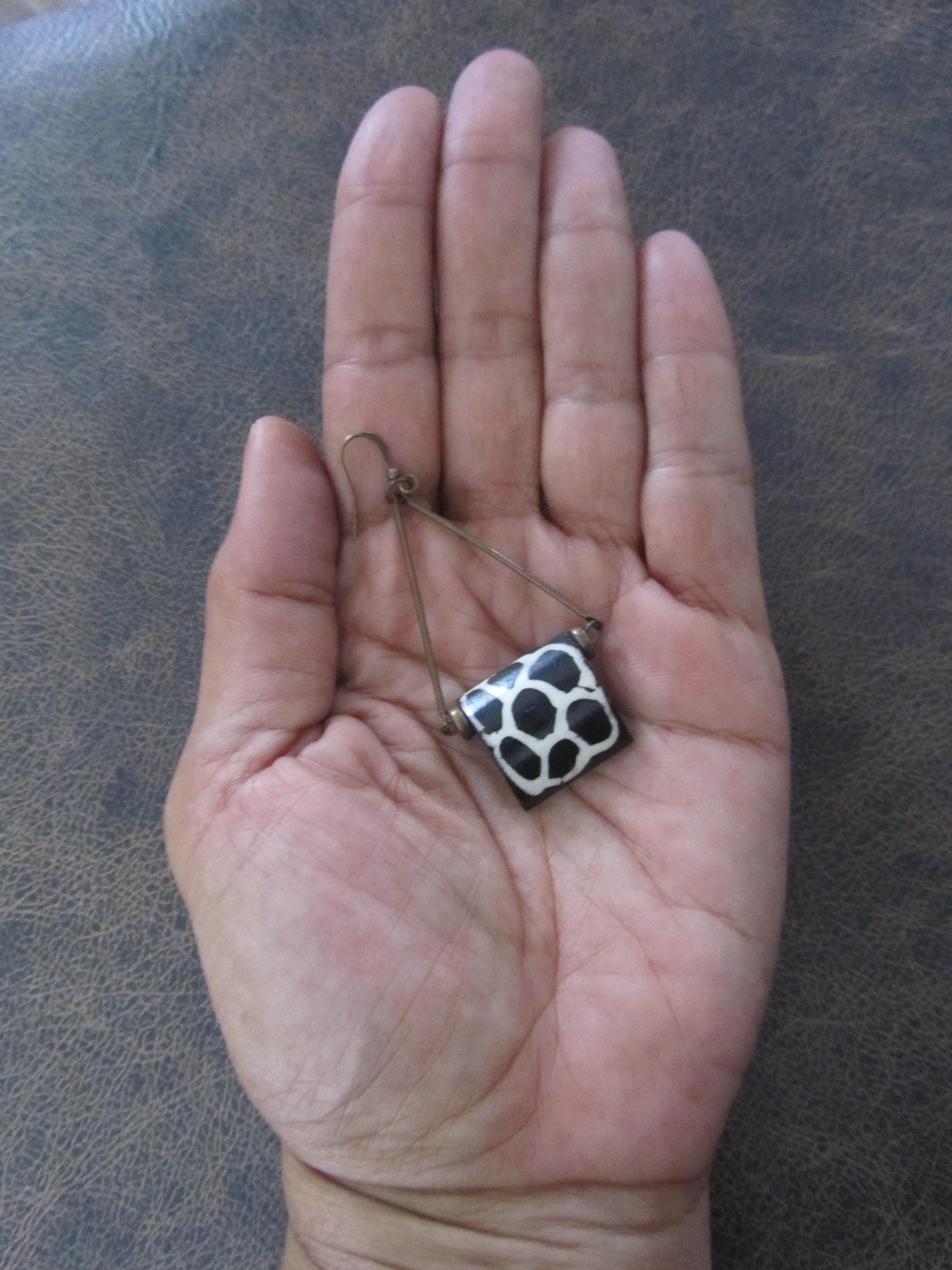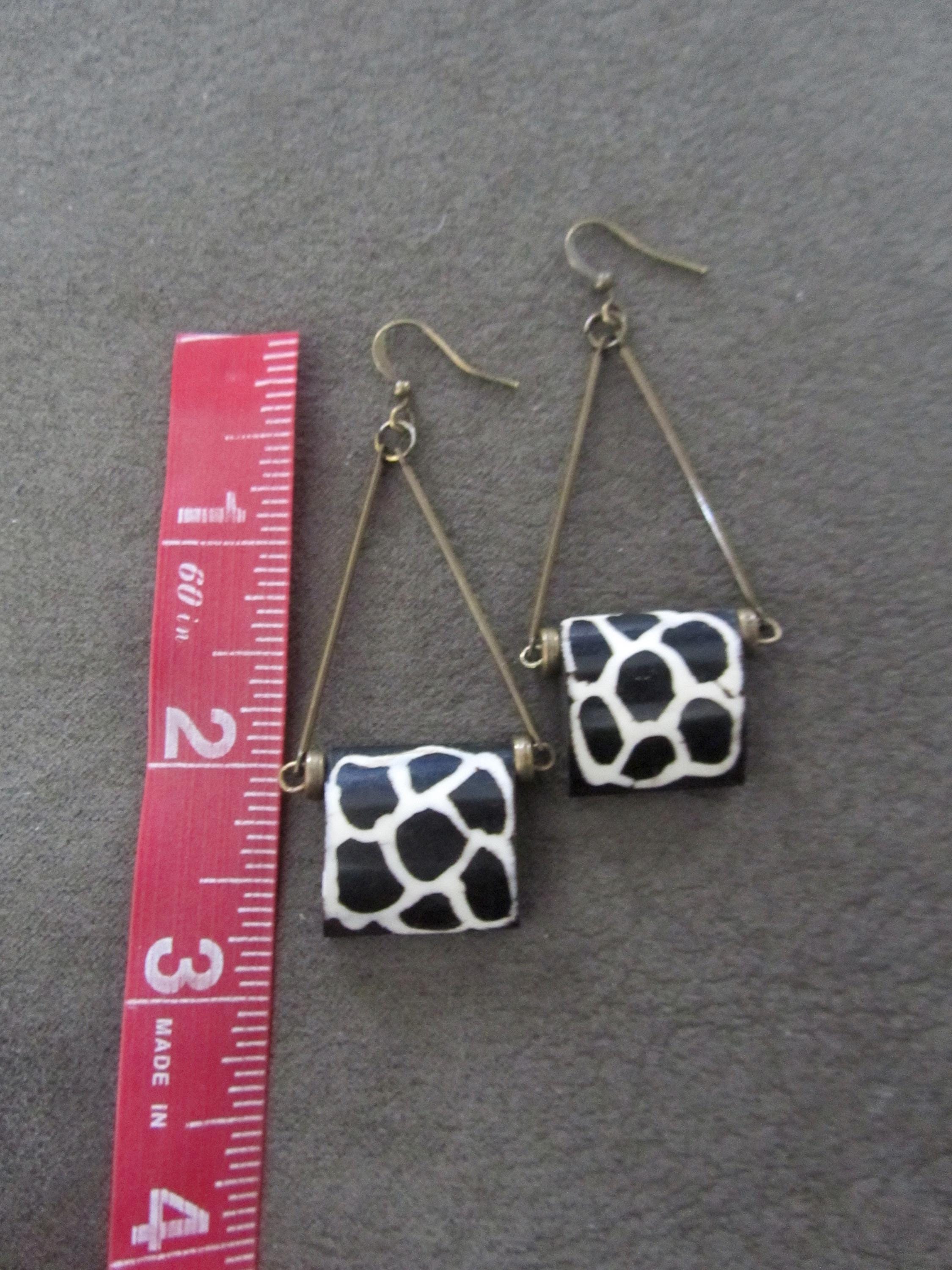 black and white print bone earrings with French hooksup cycled from a bracelet