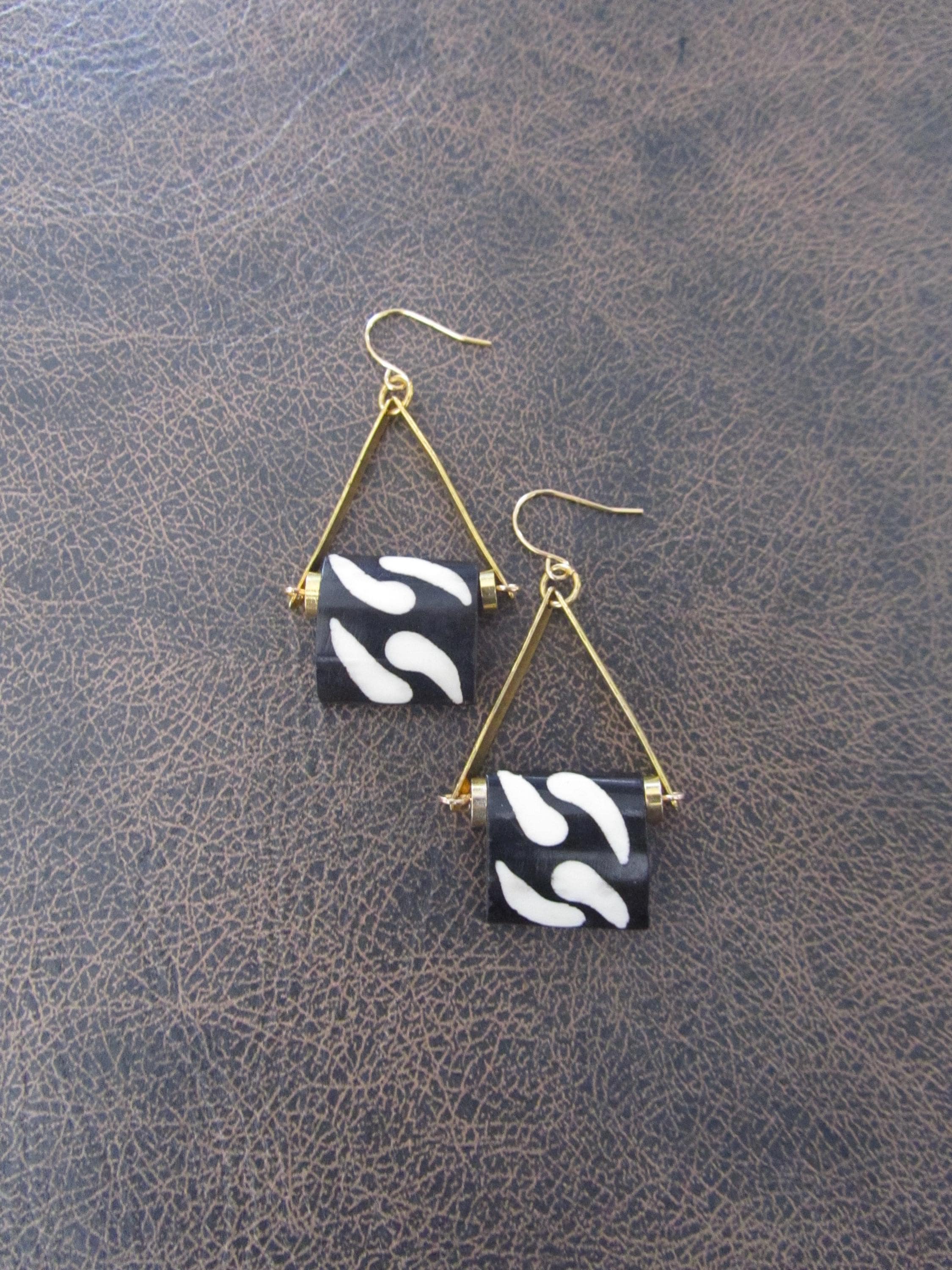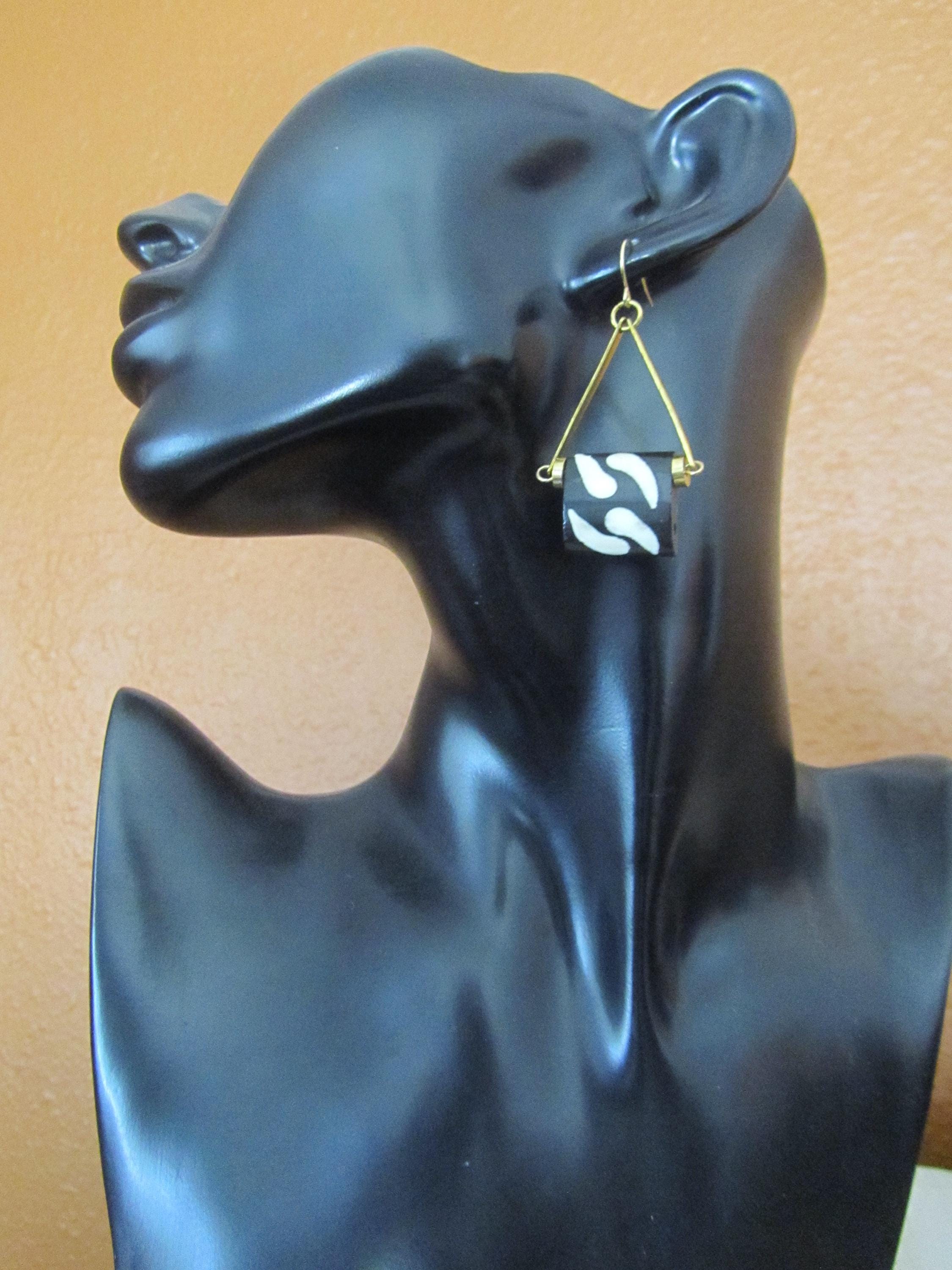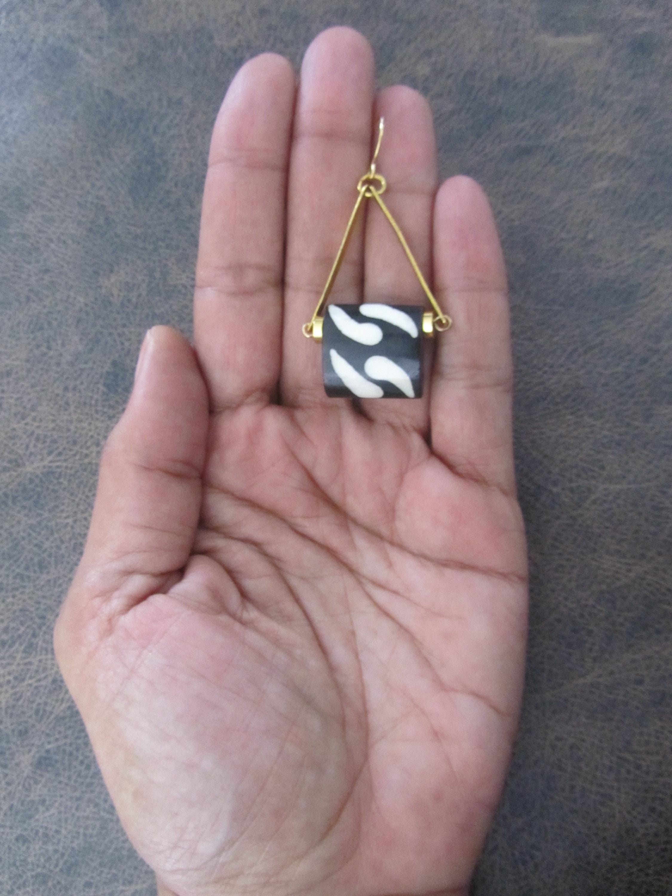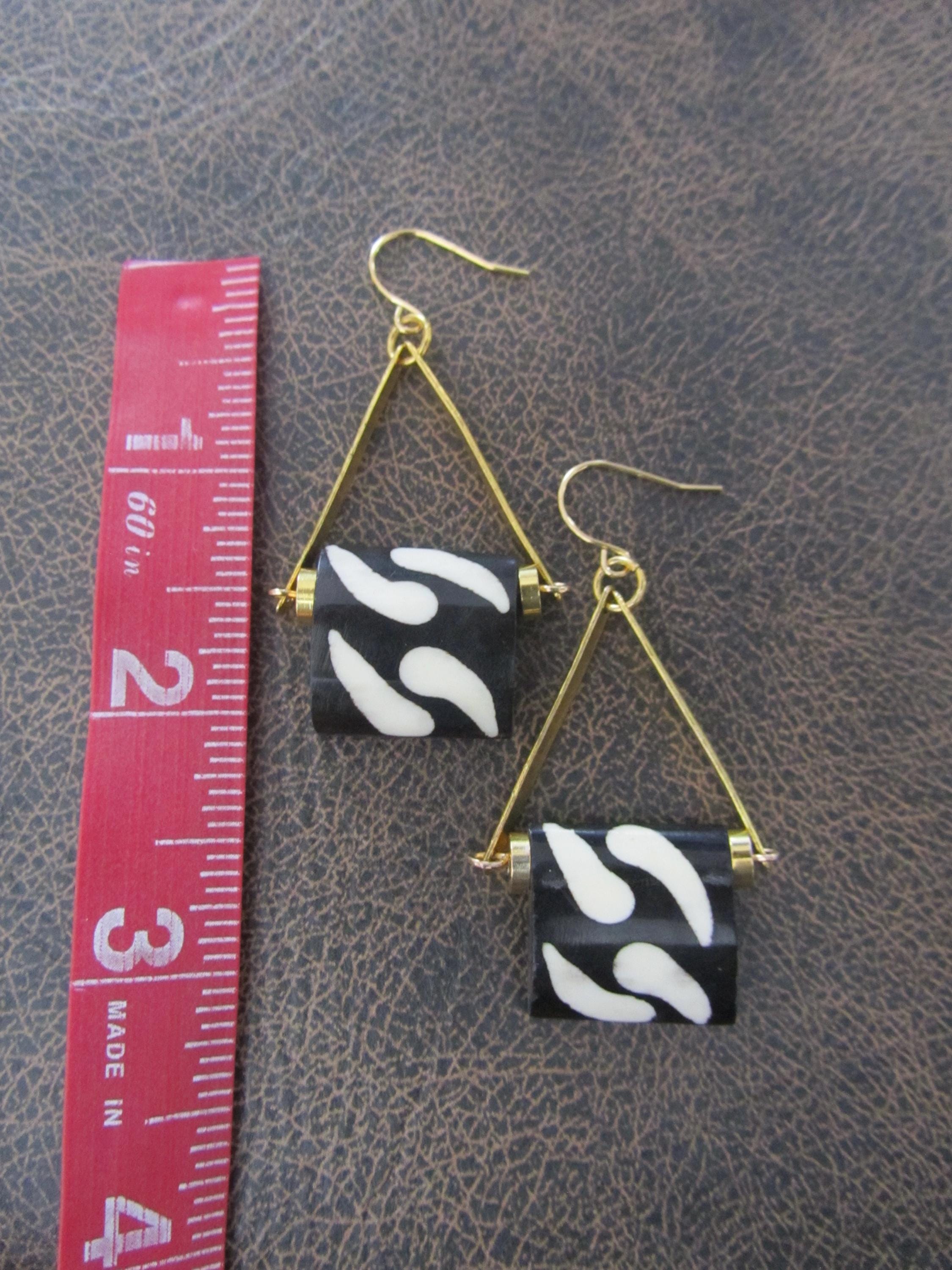 black and white print bone earrings with French hooksup cycled from a bracelet
