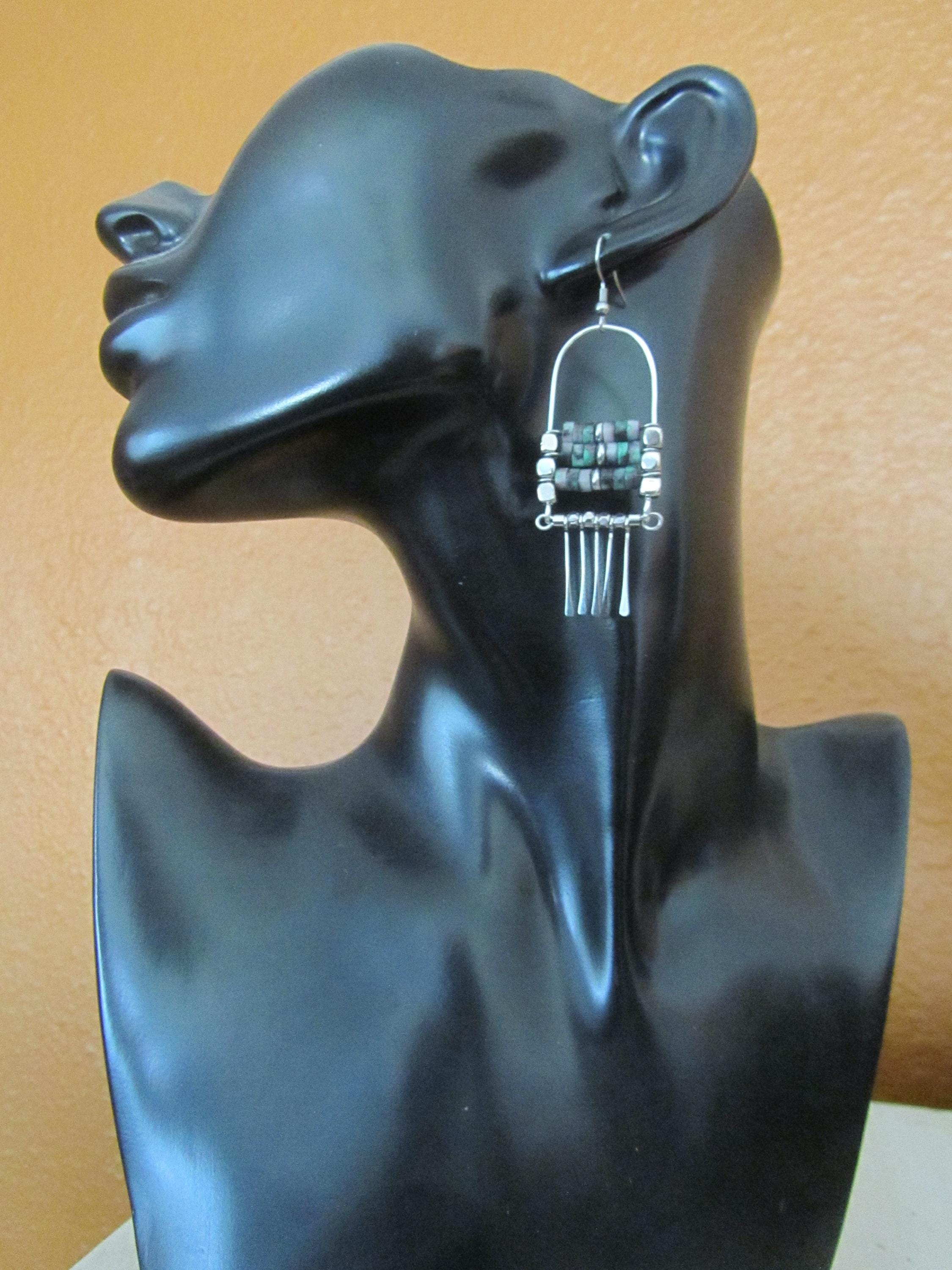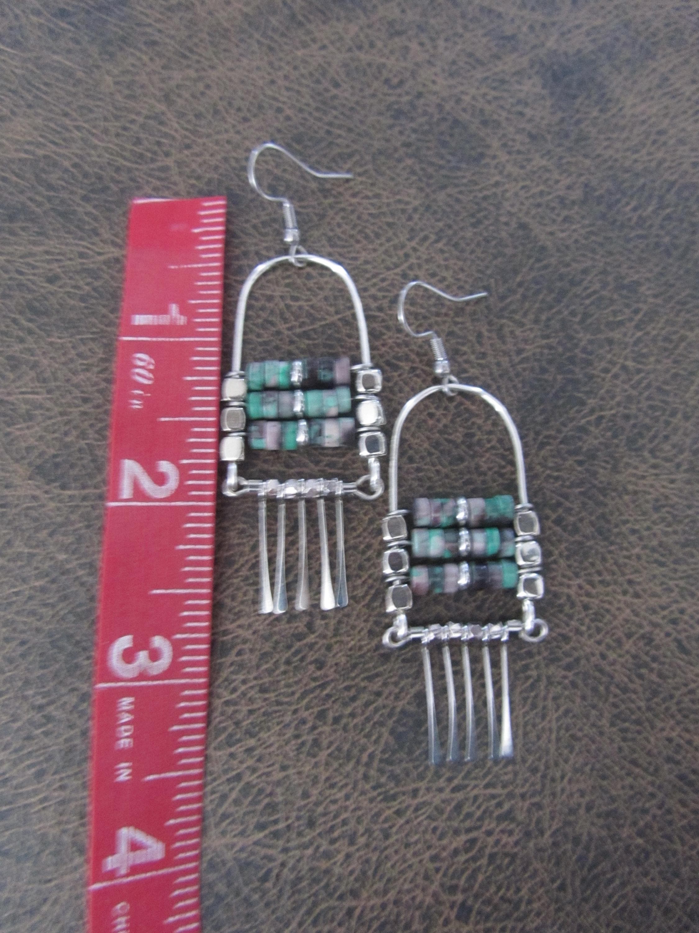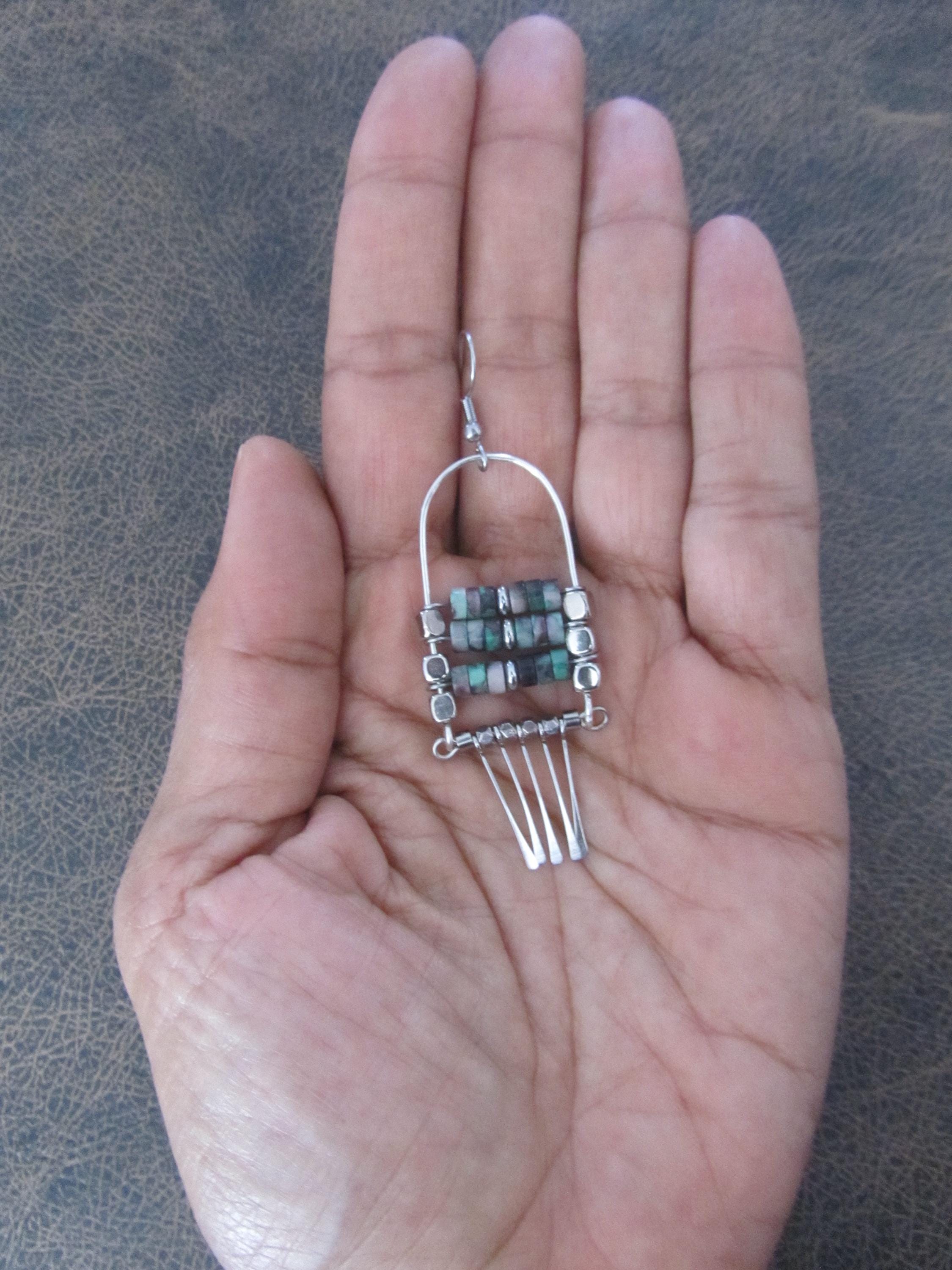 Chandelier earrings with gray and green and silver beads and stainless steel French hooks
