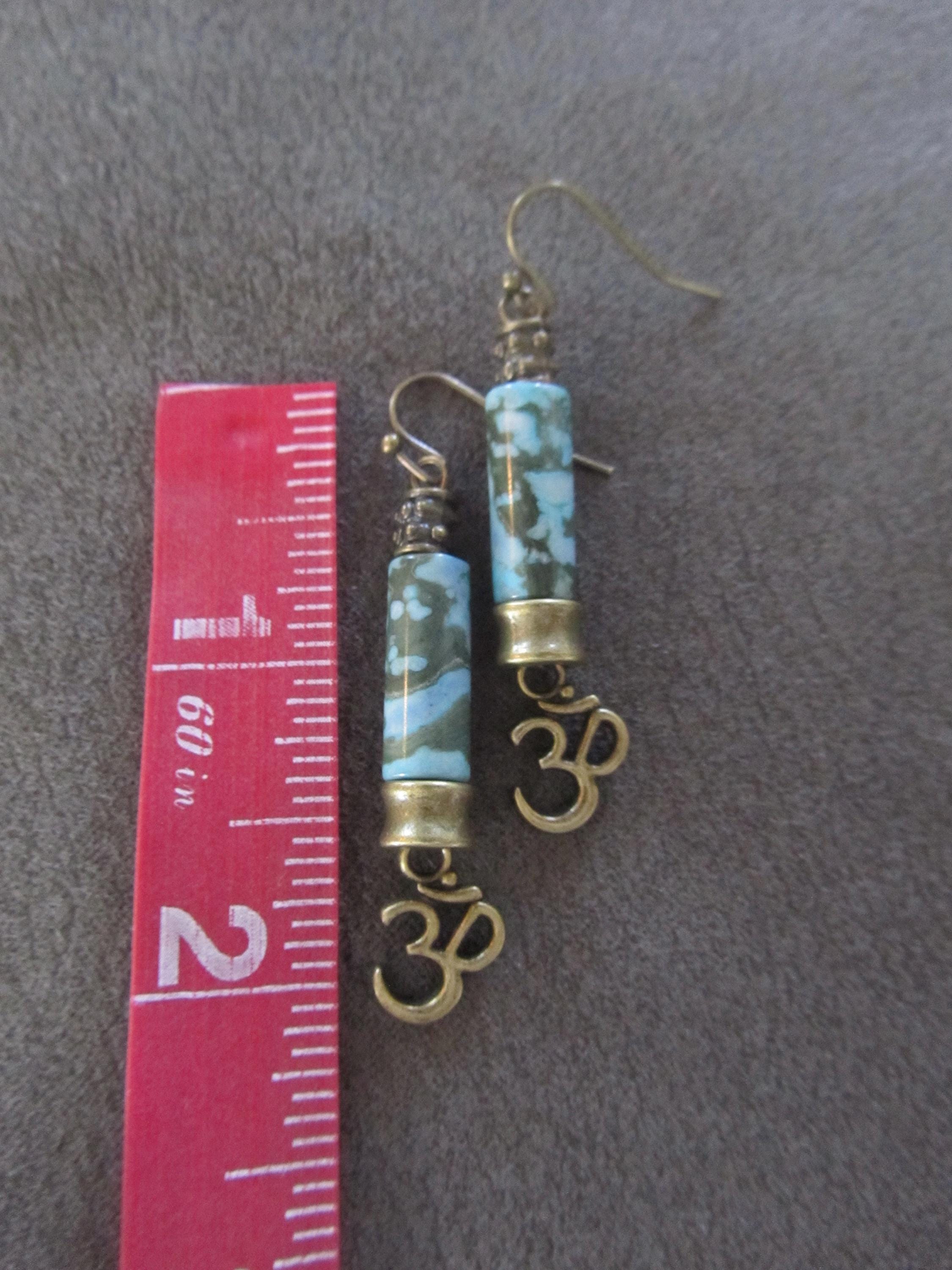 Bronze Om and blue jasper dangle earrings. French hooks
