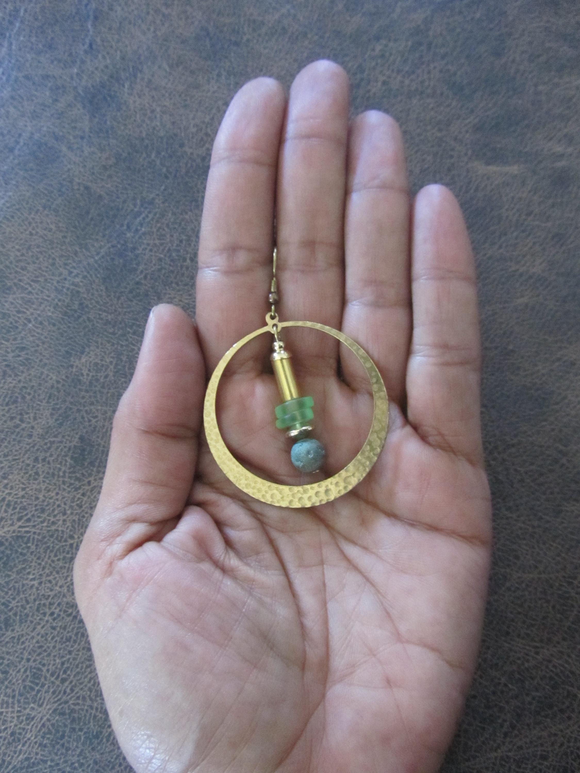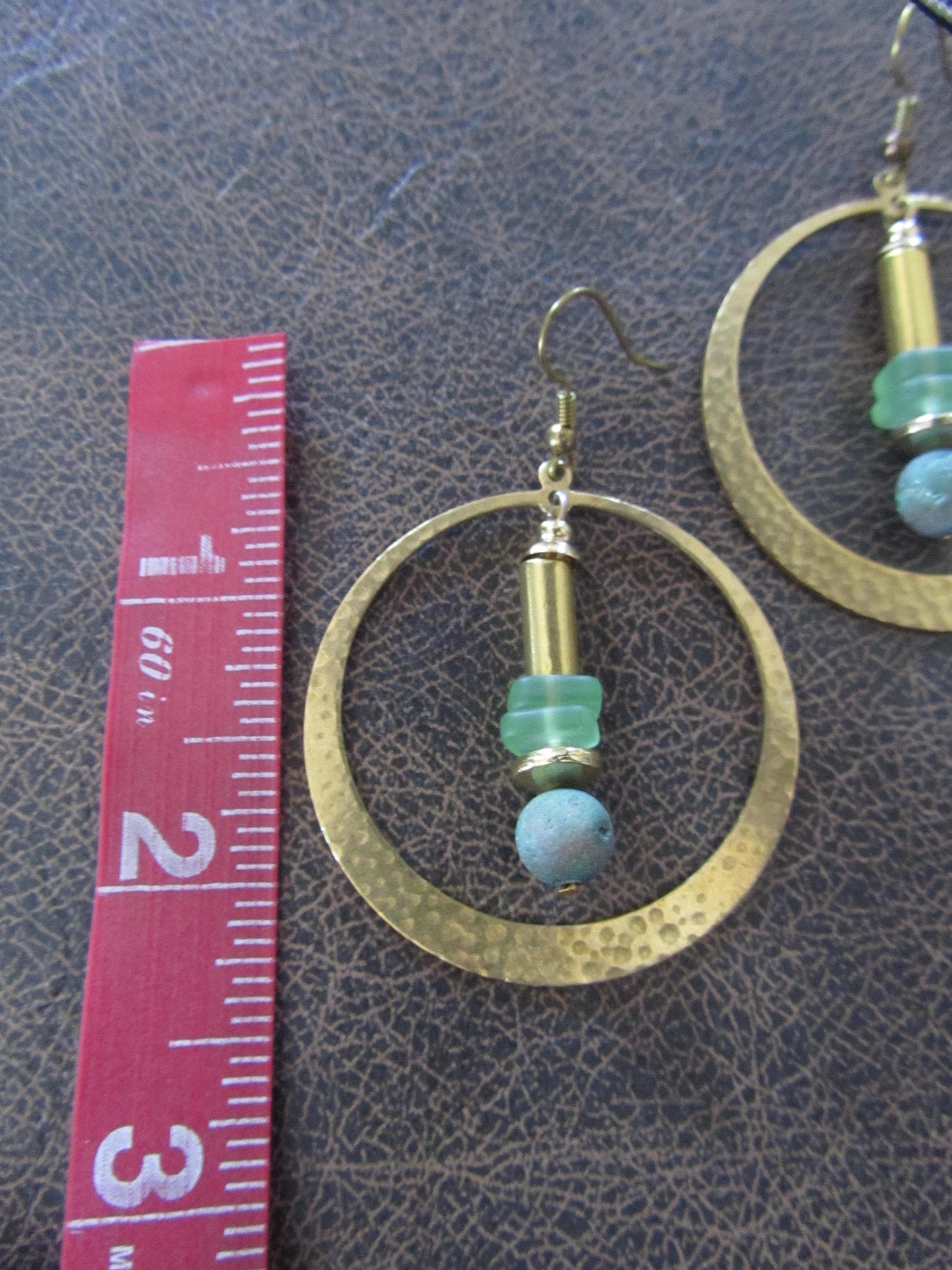 Copper hoop with green druzy and frosted glass beads. French hooks