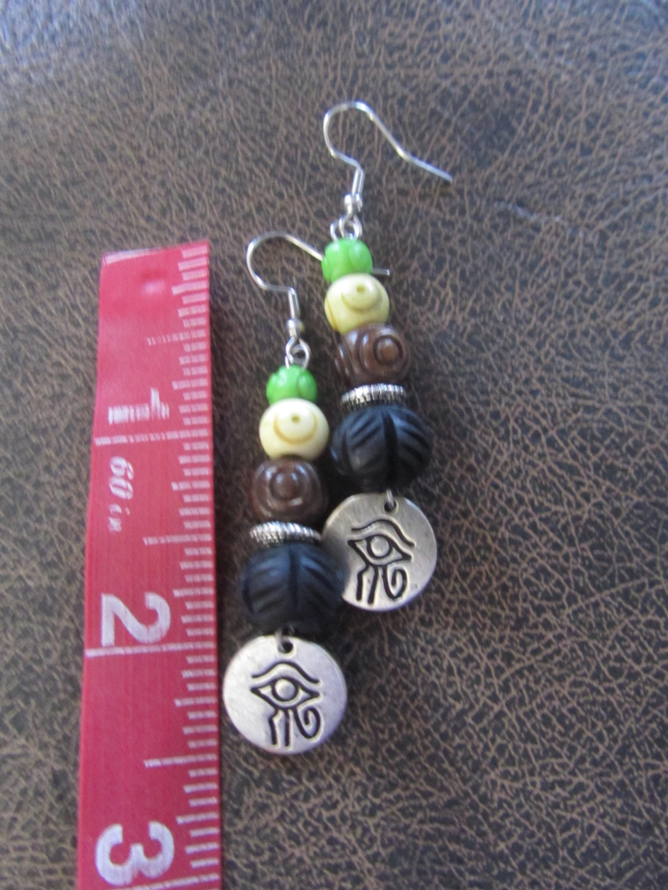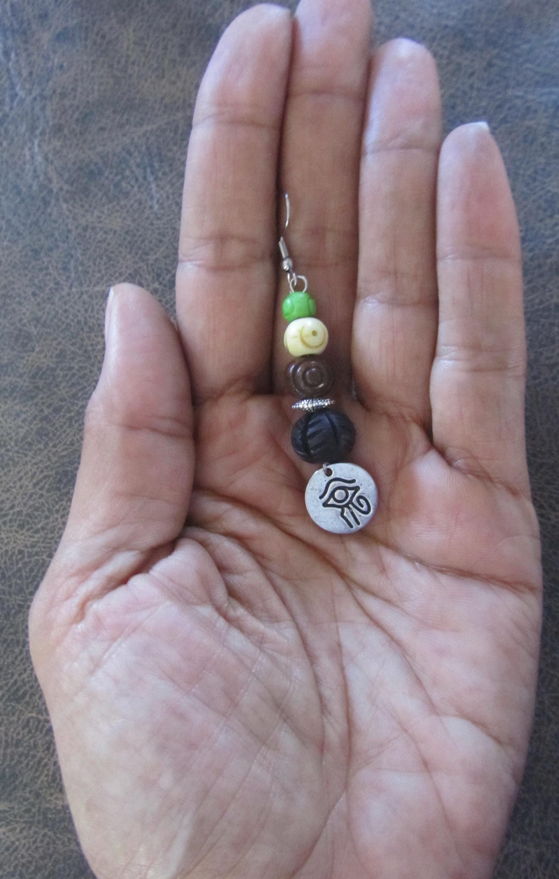 Silver evil eye and carved bone dangle earrings. French hooks