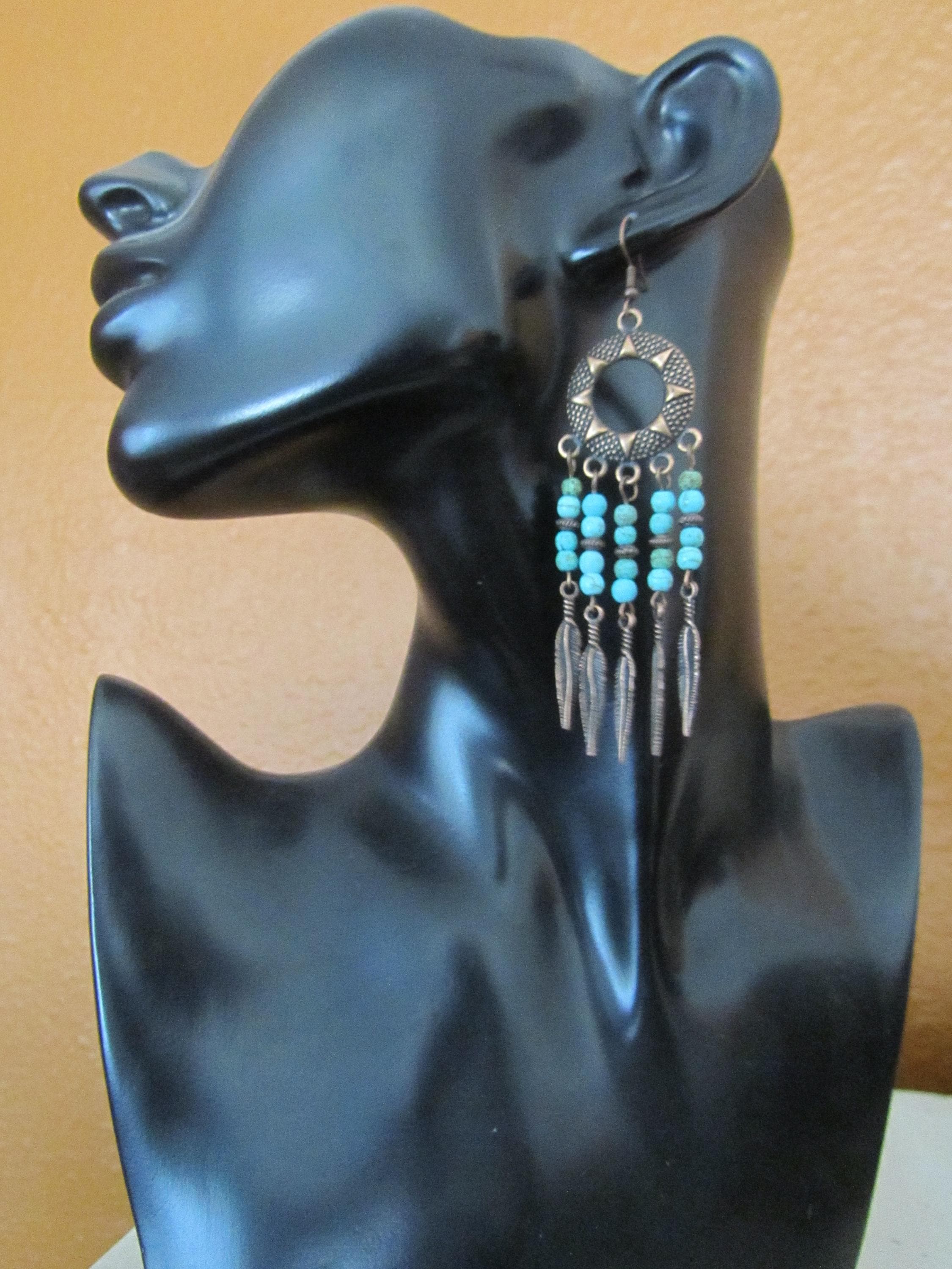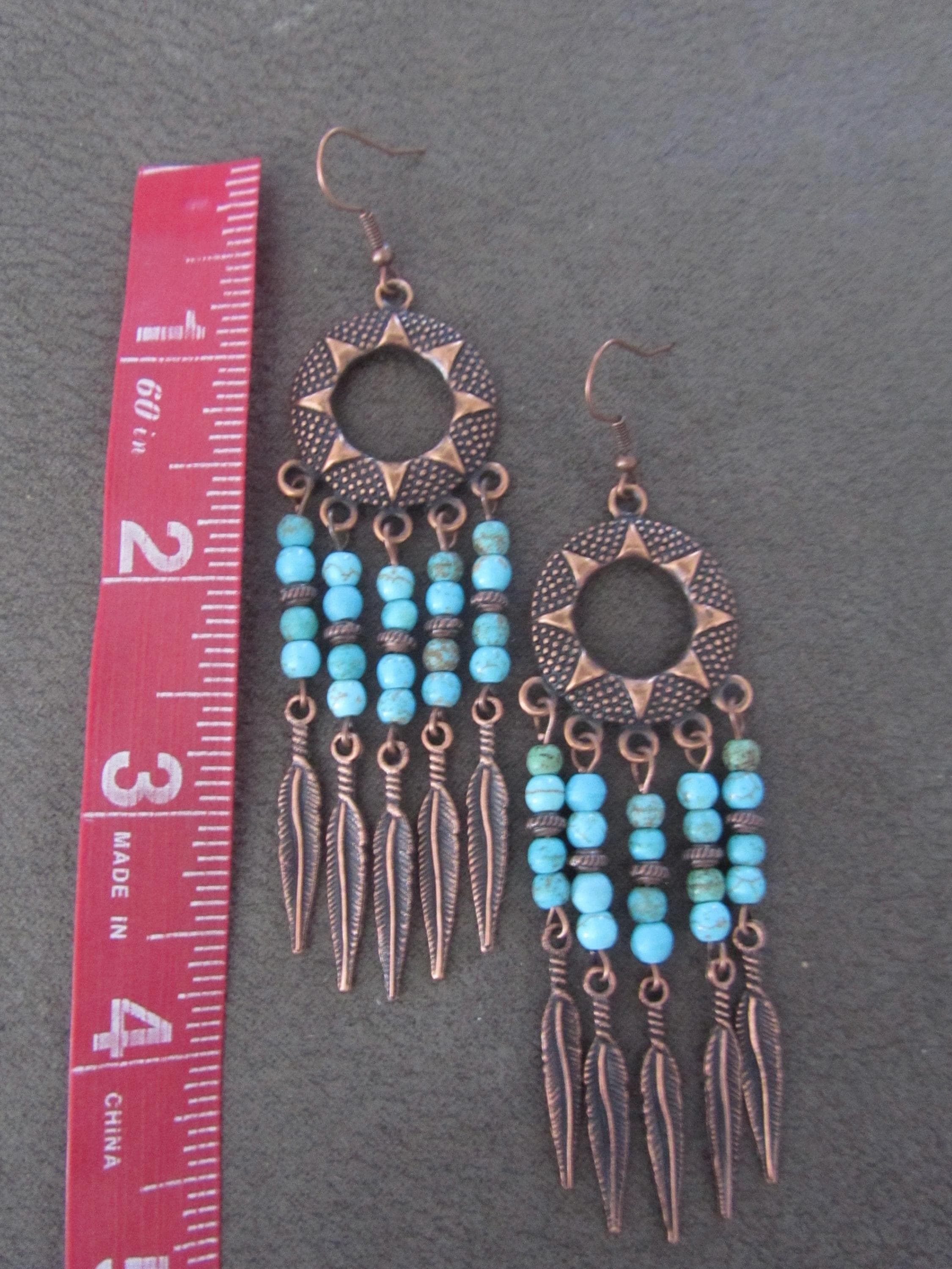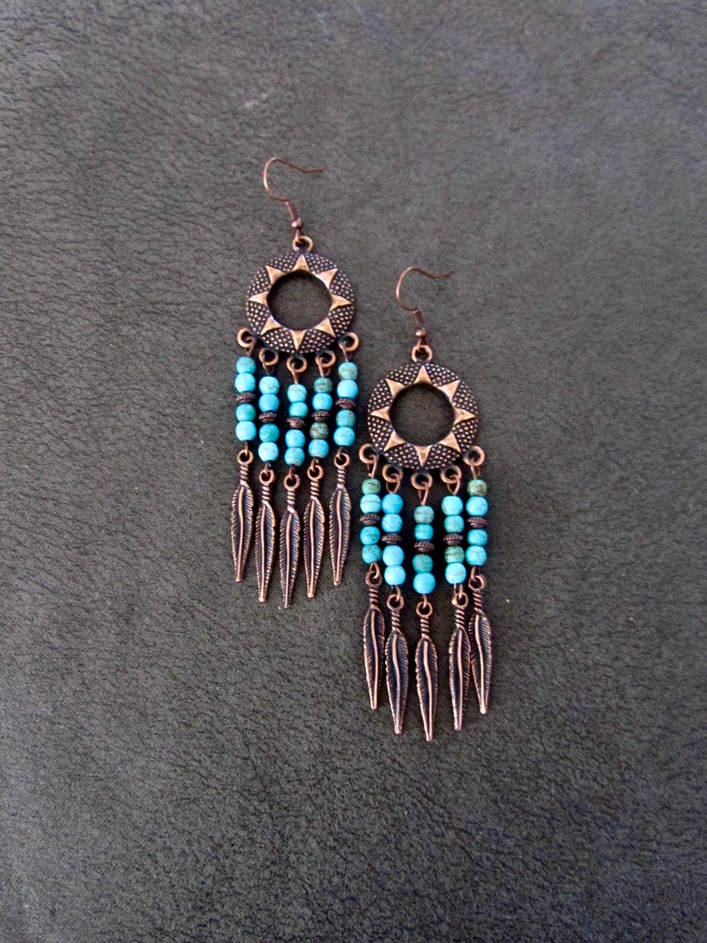 Copper and turquoise beaded chandelier earrings on French hooks