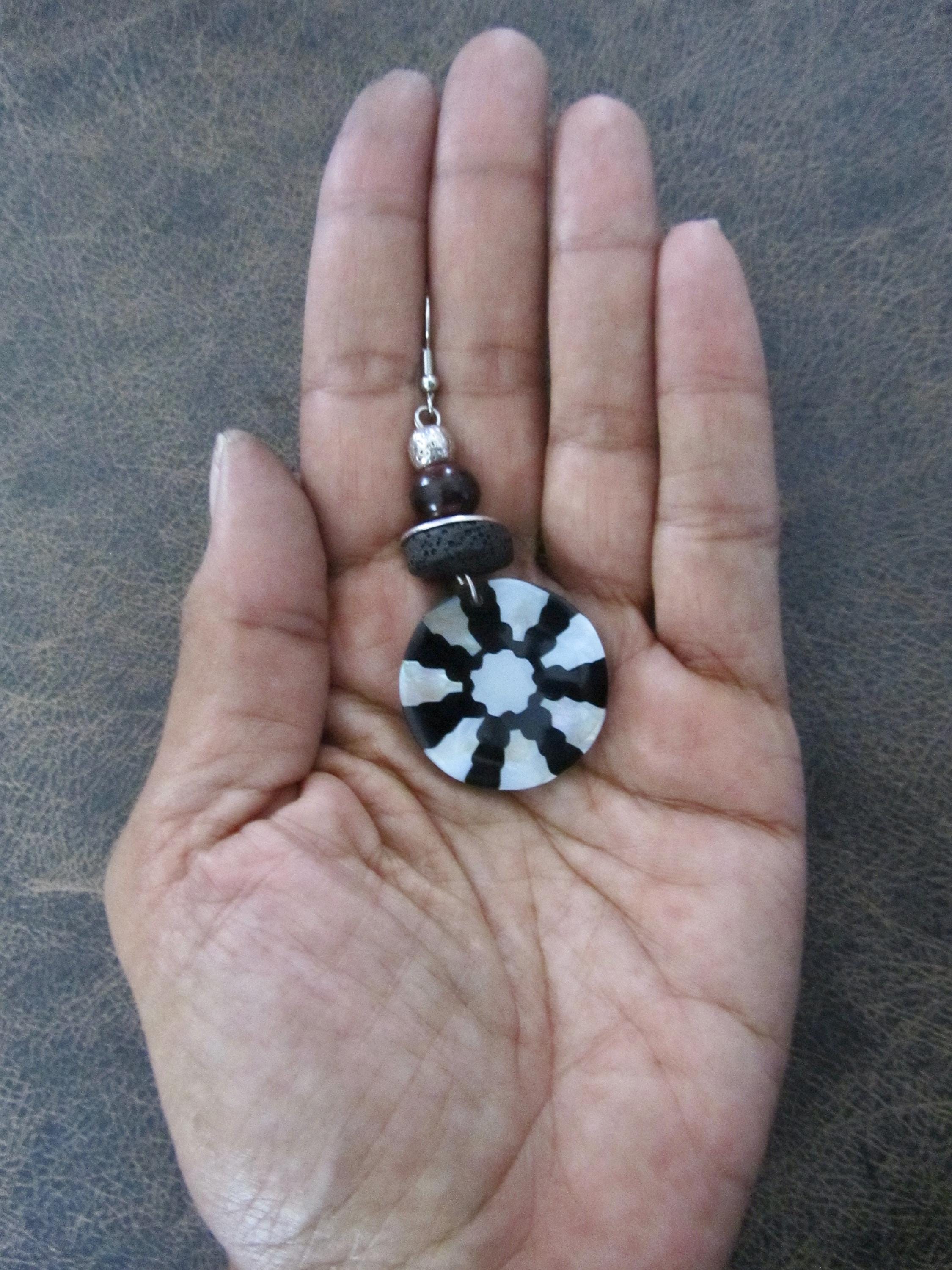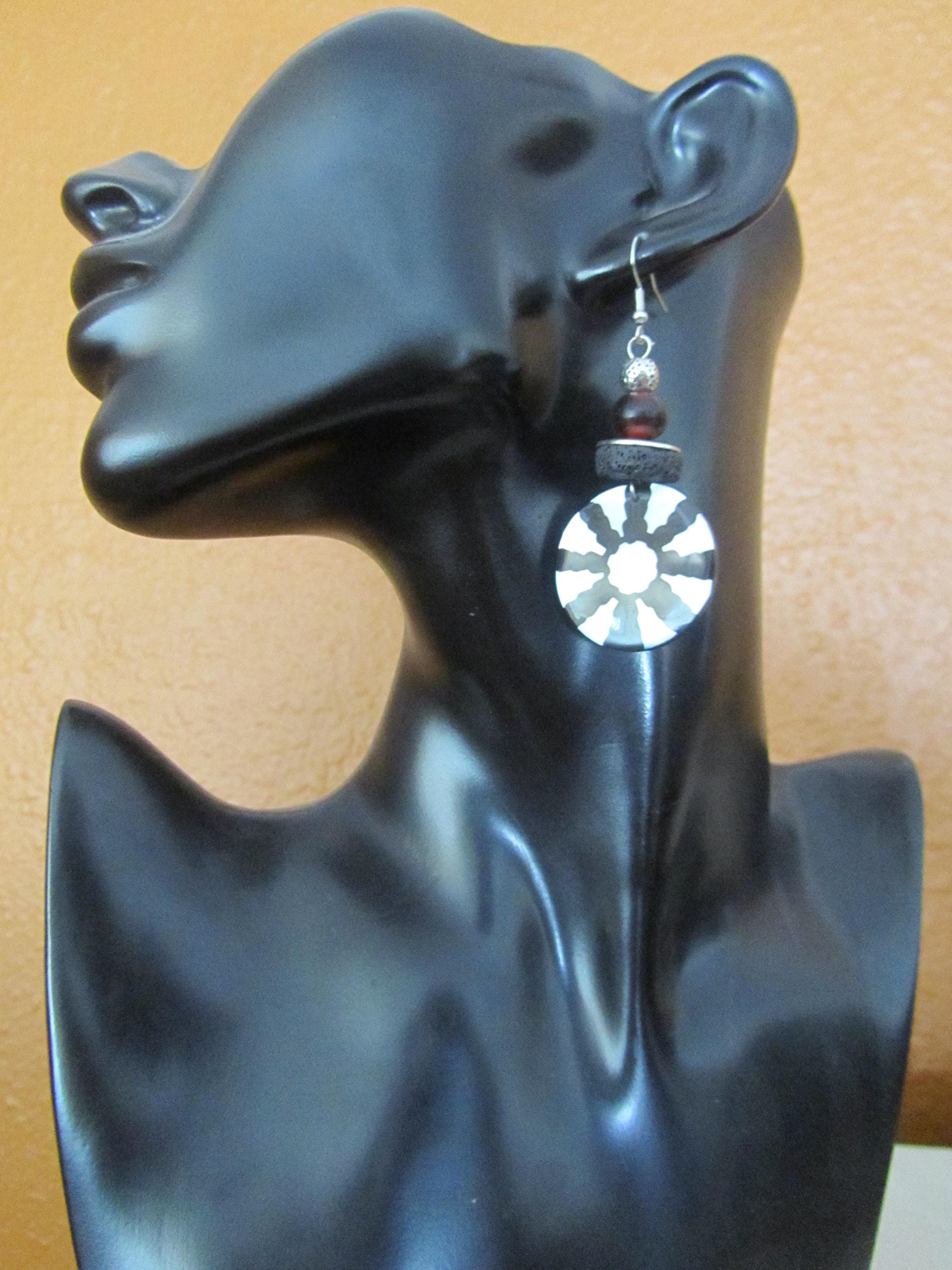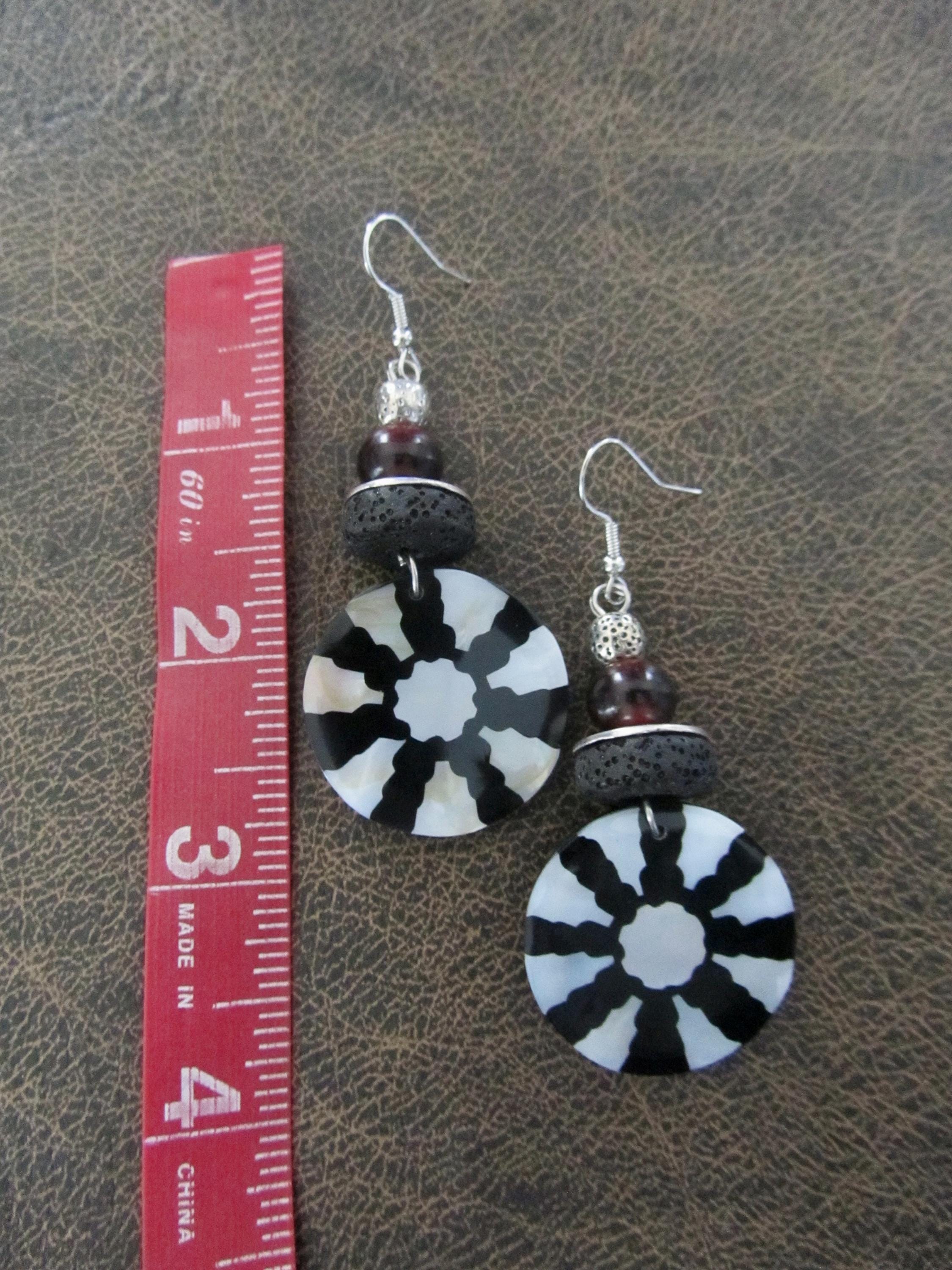 Shell, a red bone bead, and black lava rock dangle earrings on French hooks