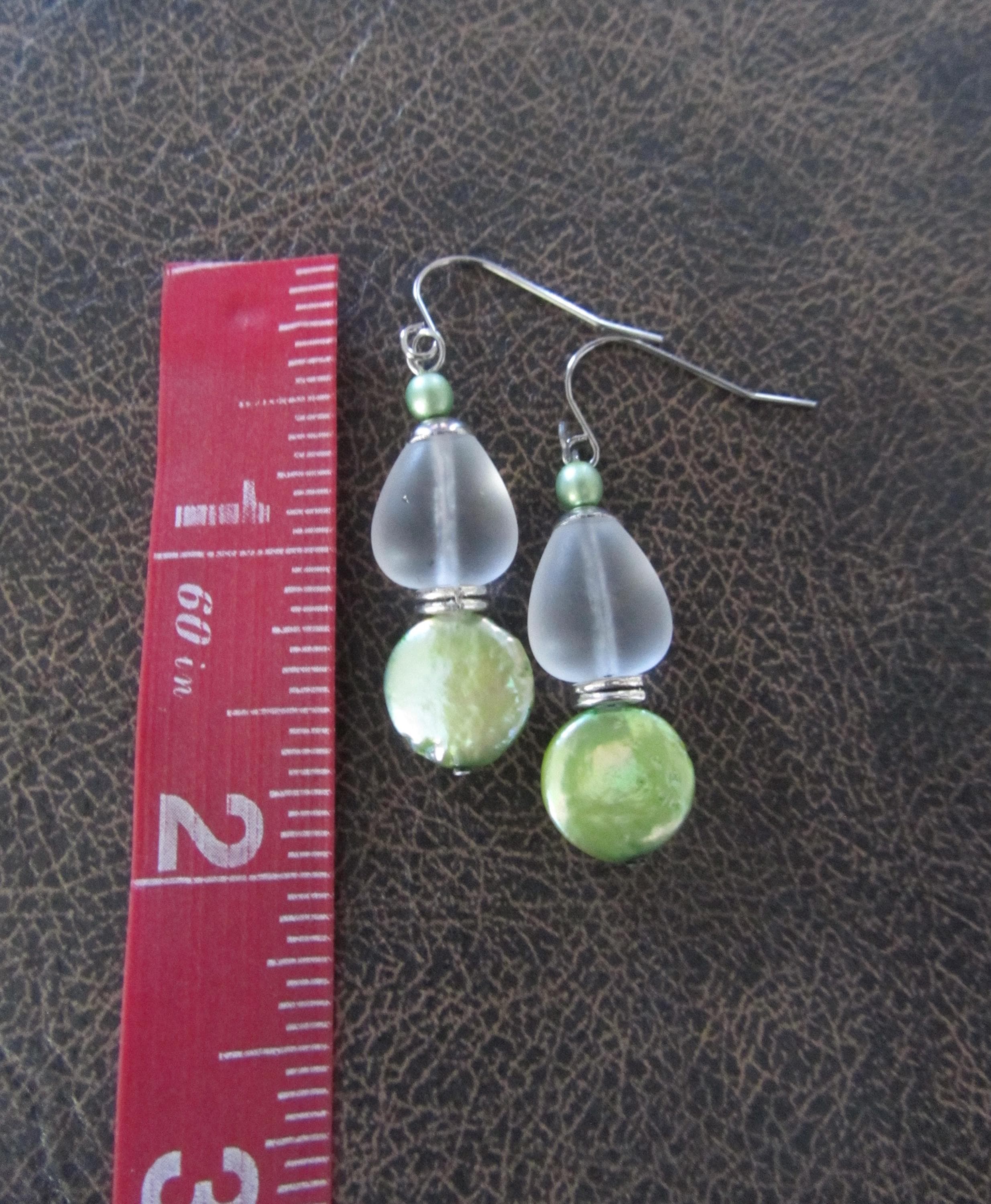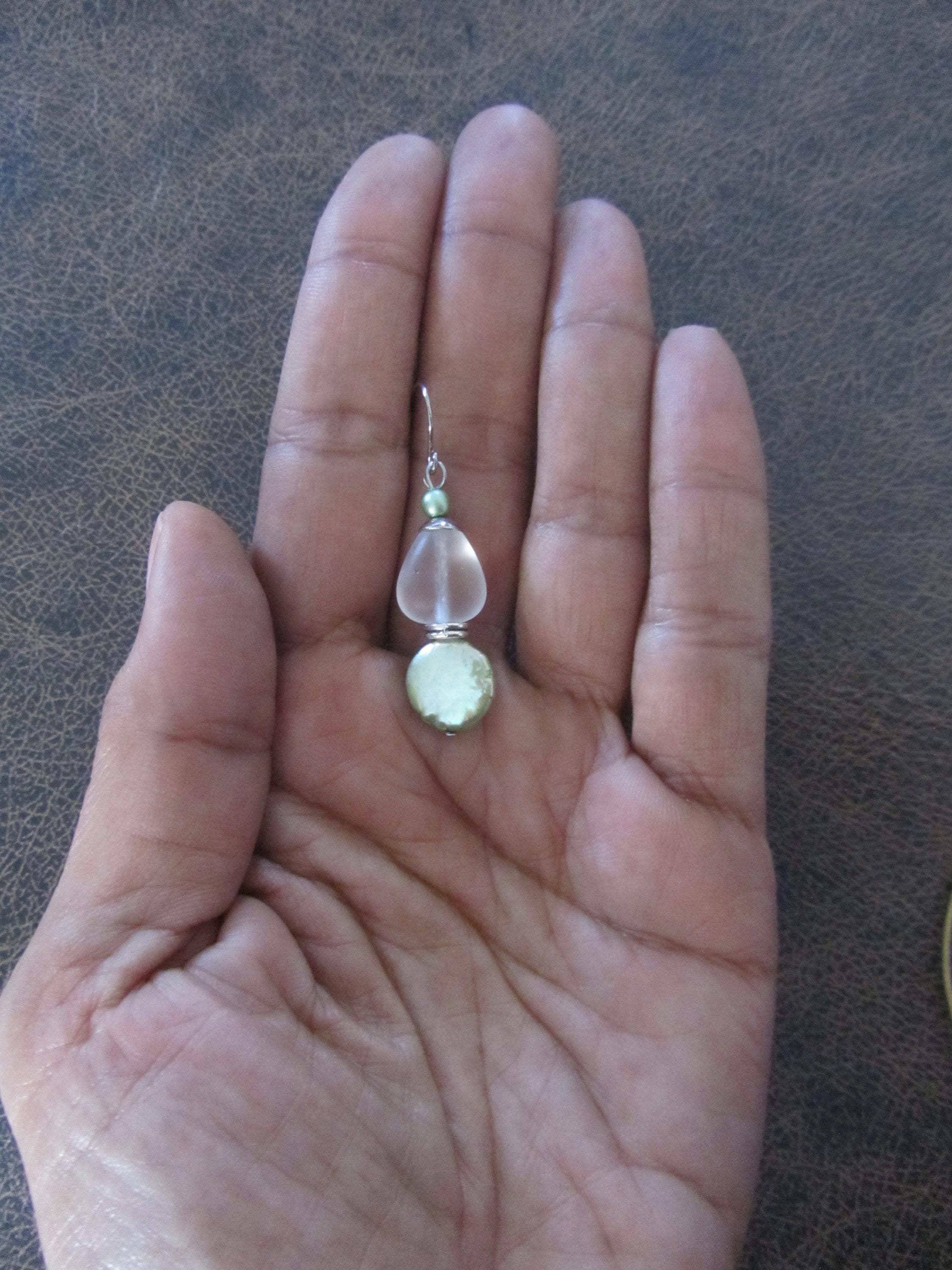Clear frosted glass and green mother of pearl earrings on French hooks