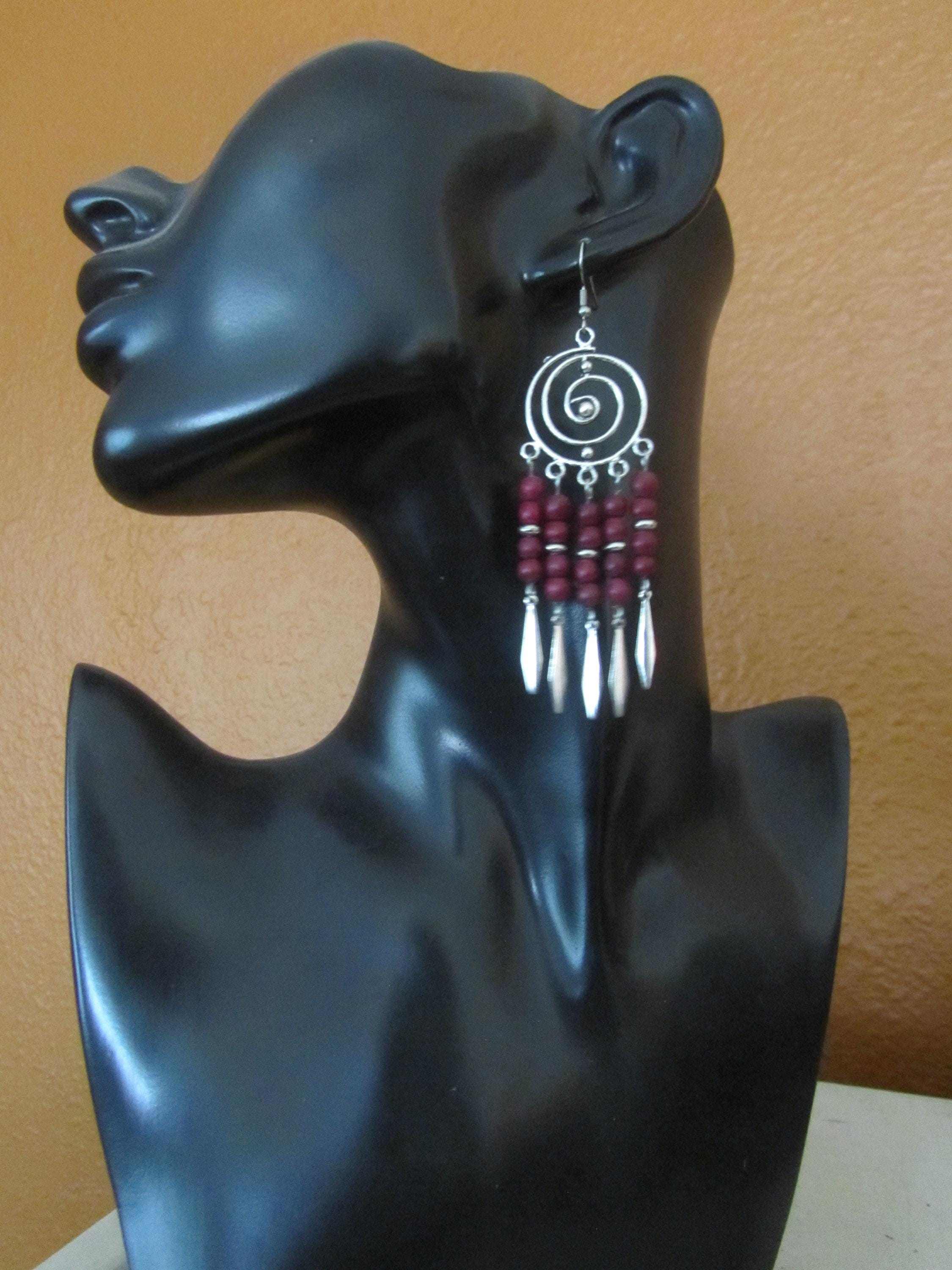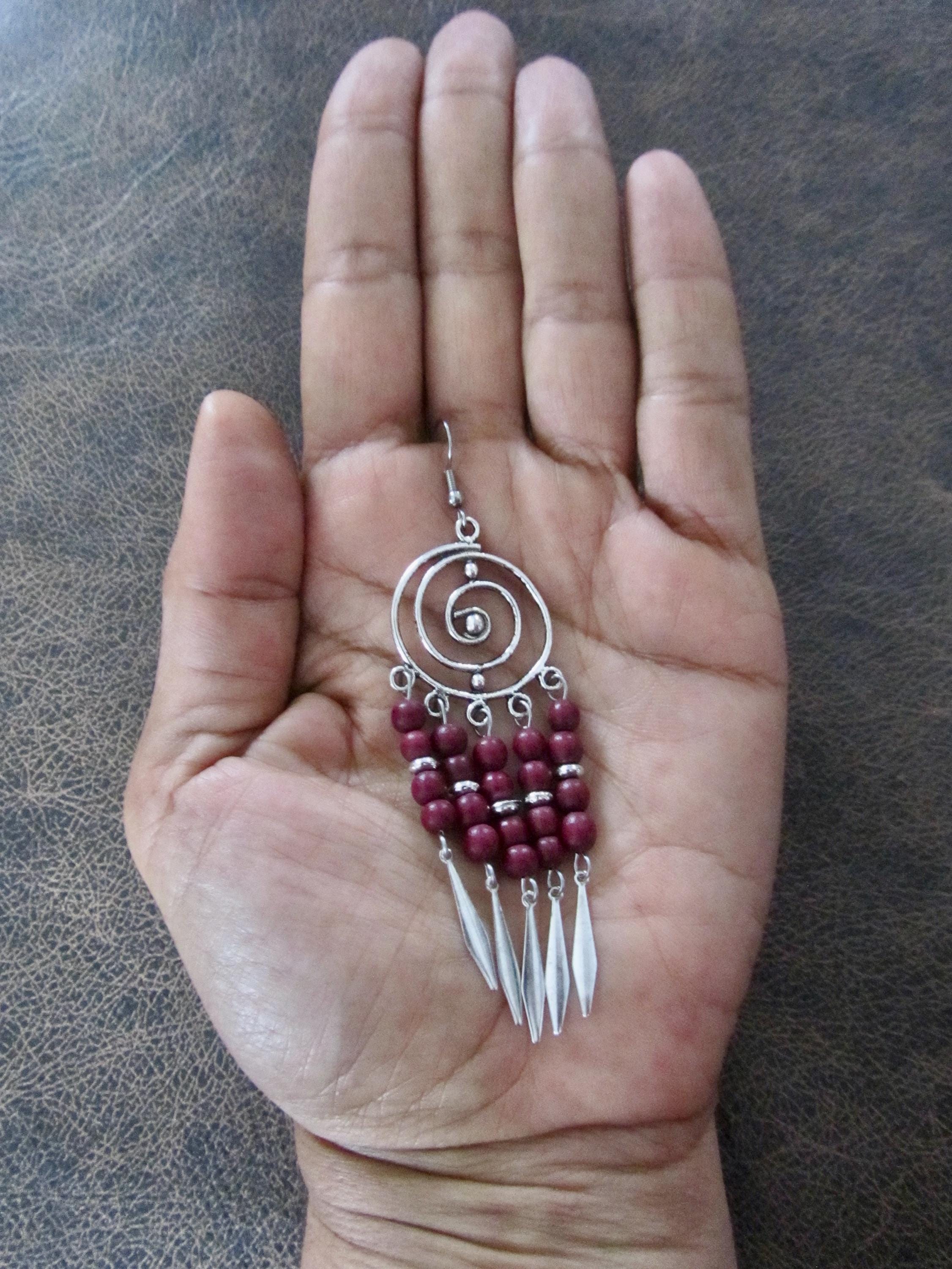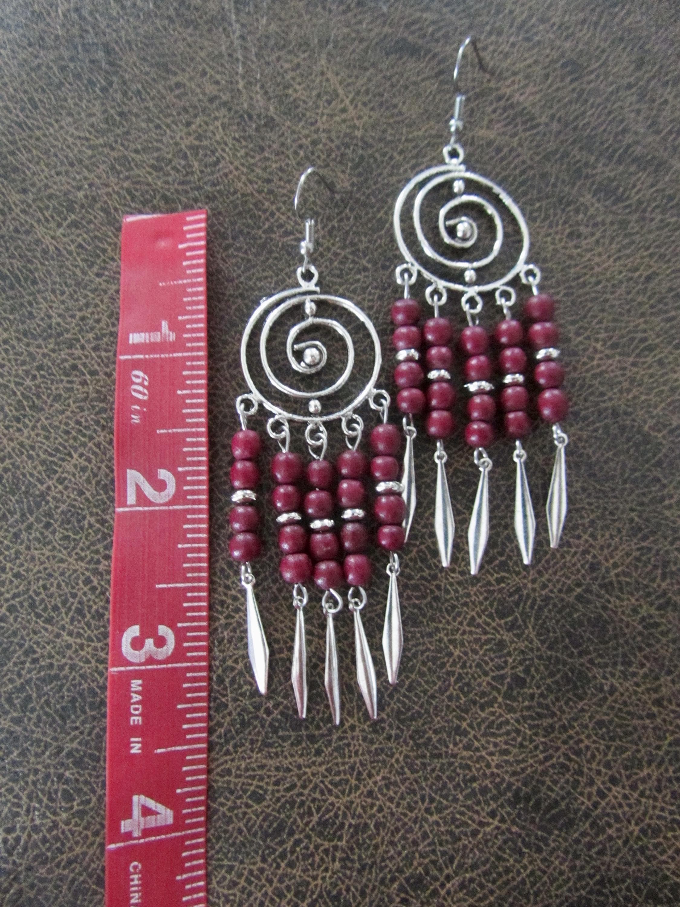 Silver chandelier earrings with red/purple beads on French hooks