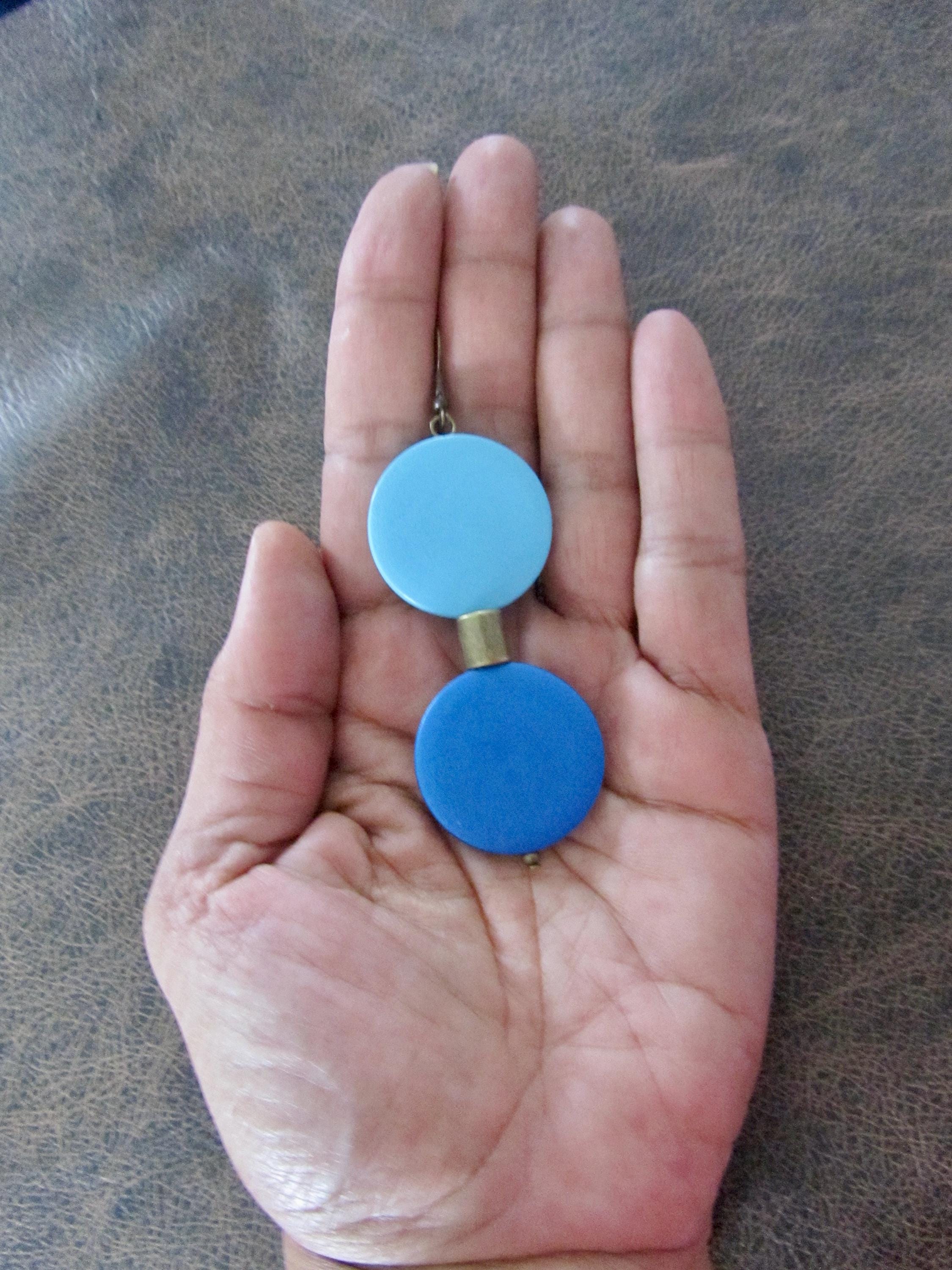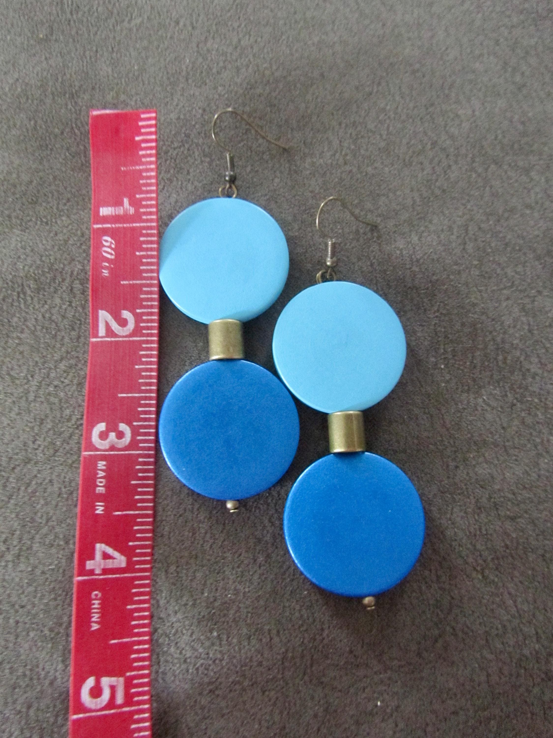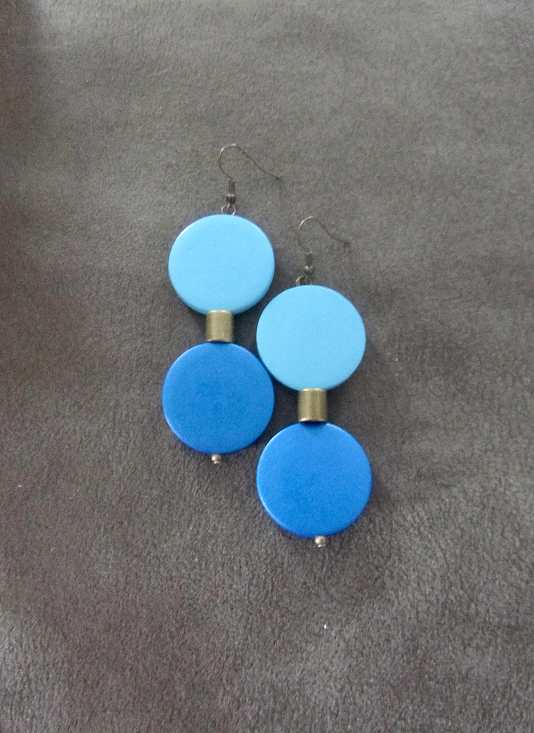 Geometric earrings with blue wood and bronze beads with French hooks