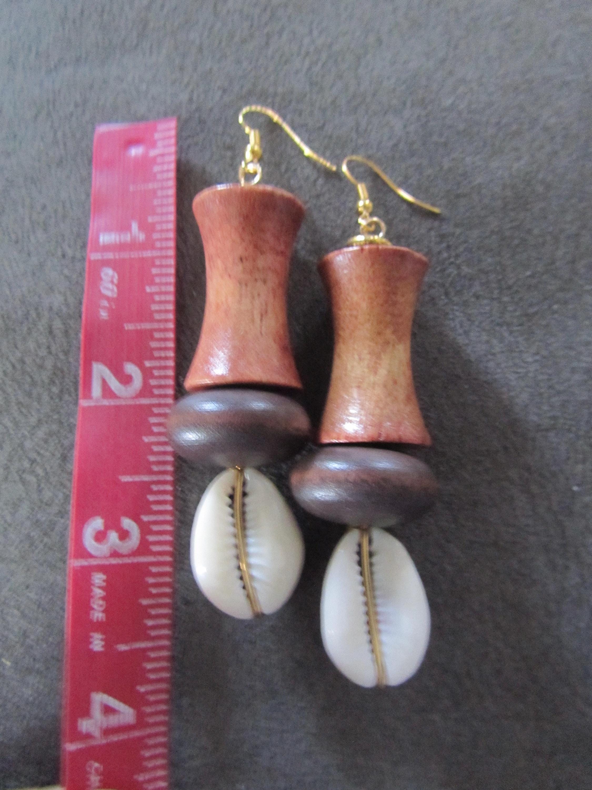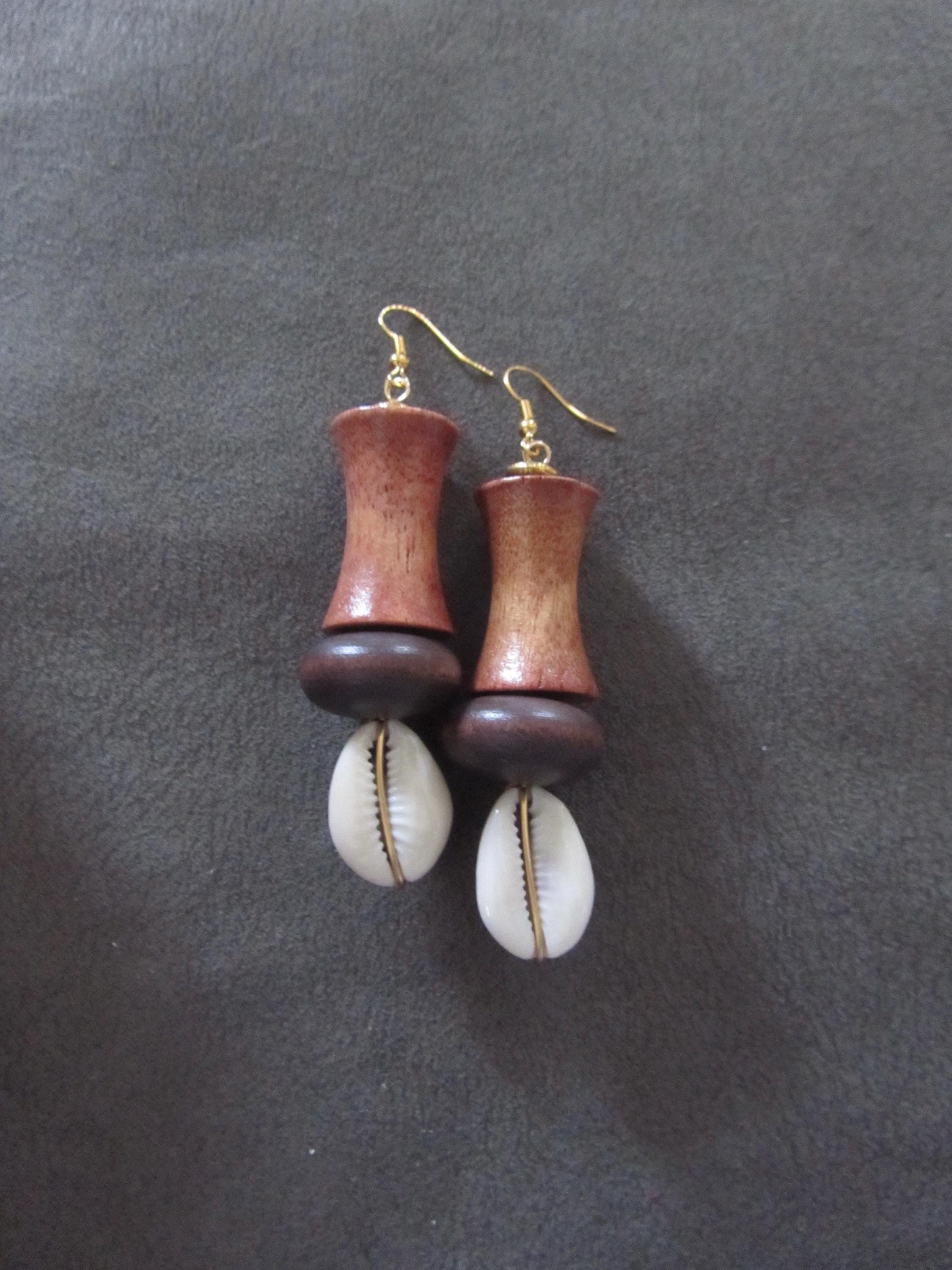 Cowrie shell, wooden, and gold dangle earrings. French hooks