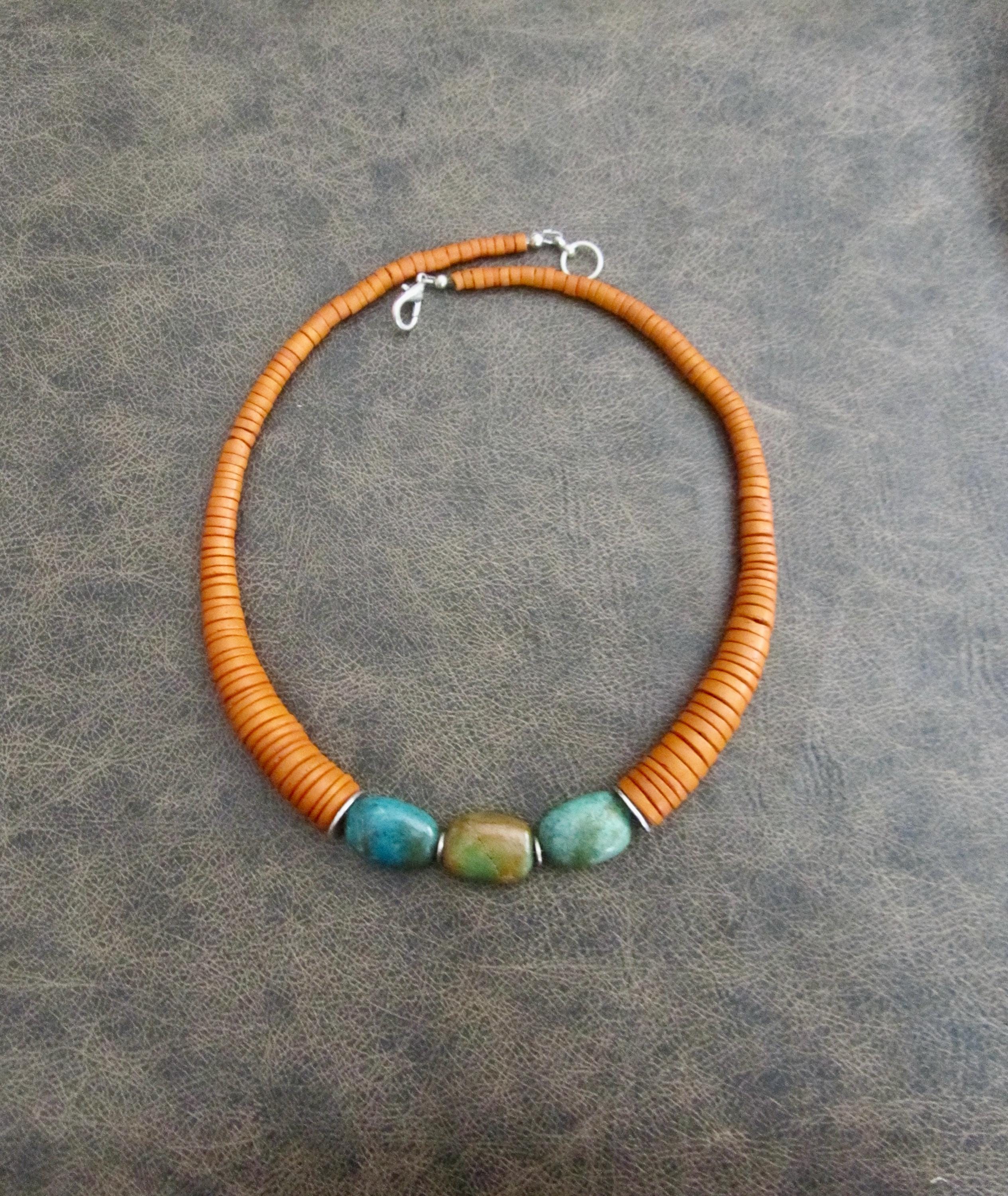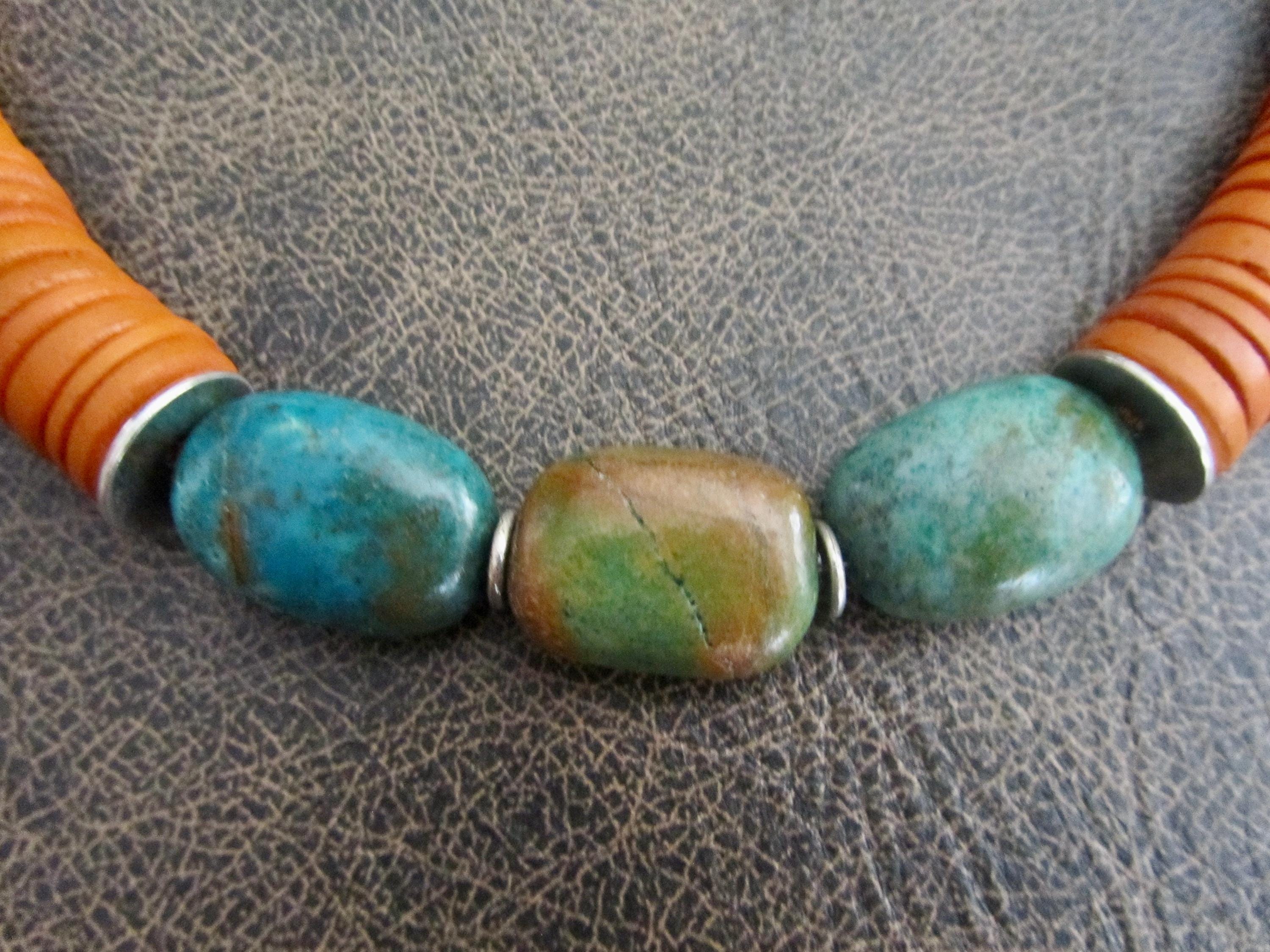 Genuine turquoise beads with graduated orange wood beaded necklace with toggle clasp